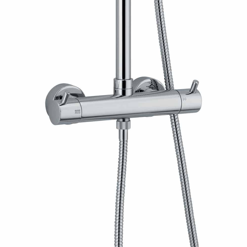Columna de ducha moderna con termostato y desviador integrado made in Italy en latón cromado con detalles en acero y ABS .