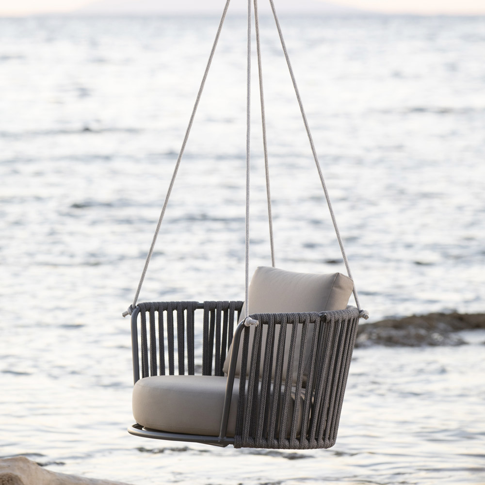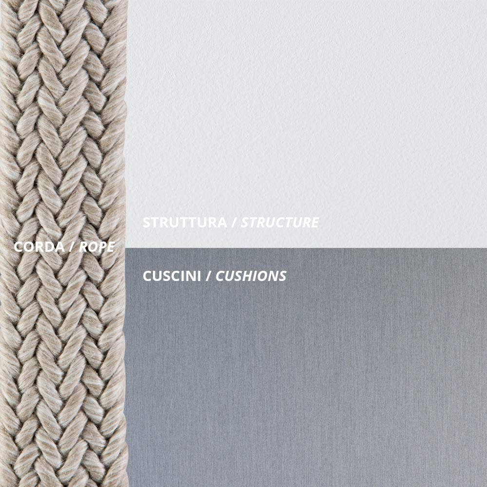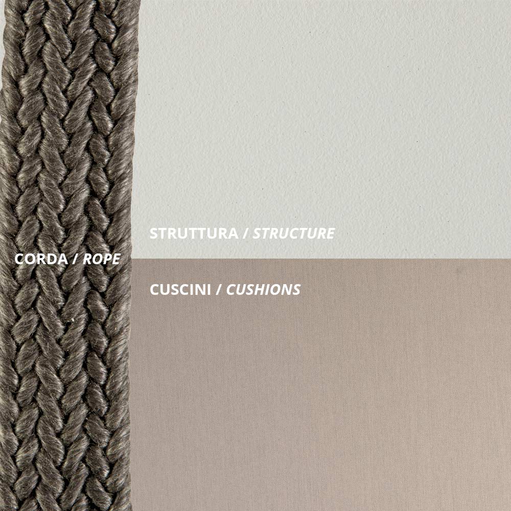 Columpio para mobiliario de exterior de acero galvanizado y cuerda, fabricado íntegramente en Italia, con cojines de asiento y respaldo y cuerdas incluidas . El galvanizado proporciona una mayor resistencia del acabado a los agentes atmosféricos corrosivos, mientras que las cuerdas son resistentes al cloro, la luz solar y el moho. Los cojines están fabricados con material resistente a los rayos UV y al agua, lo que mantiene el color durante mucho tiempo, lo que convierte al columpio en un elemento perfecto para amueblar cualquier espacio exterior.