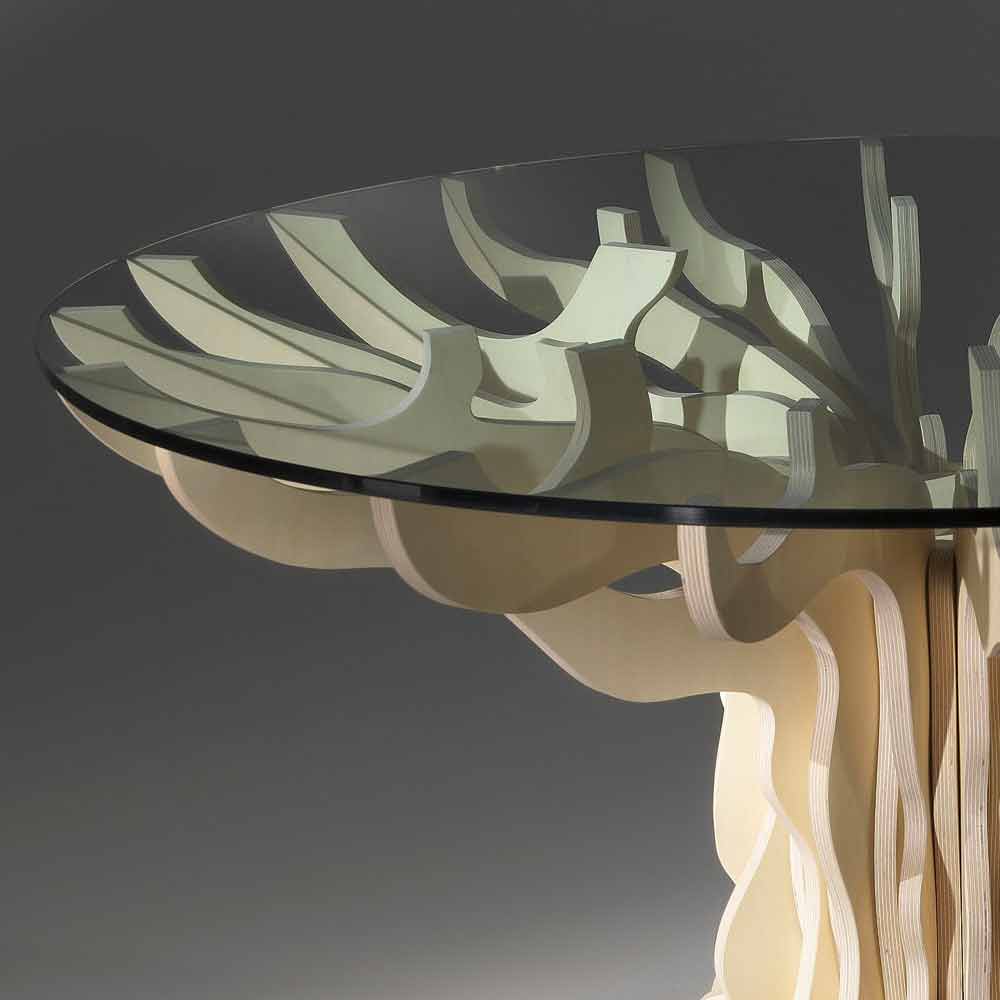Mesa de diseño moderno hecho de contrachapado de abedul natural. en clara tapa de cristal templado.