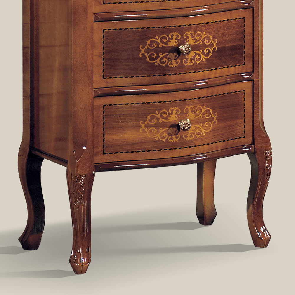 preciosa madera de nogal pulida con elegantes incrustaciones en oro. Este práctico accesorio está disponible en la versión con 4 o 6 cajones. Único y refinado, está completamente