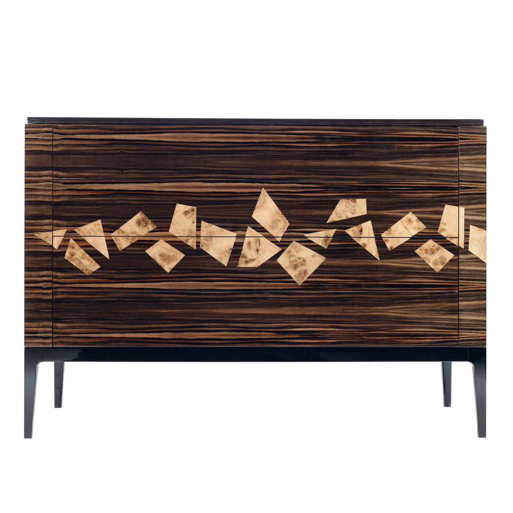 Cofre de diseño de cuatro cajones con una estructura de madera de ébano enchapada multicapa con inserciones de cilantro en briar de nogal Ferrarese.