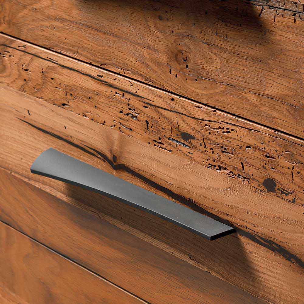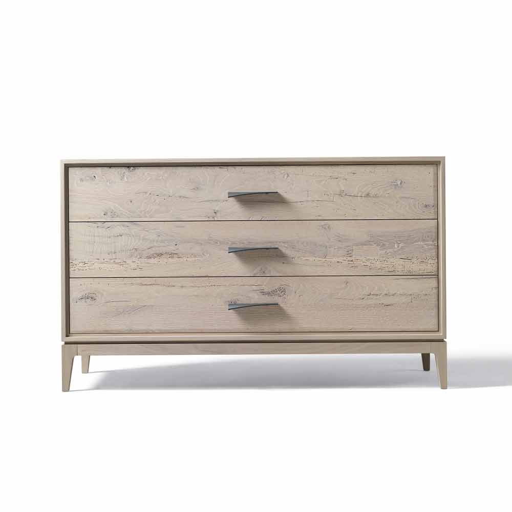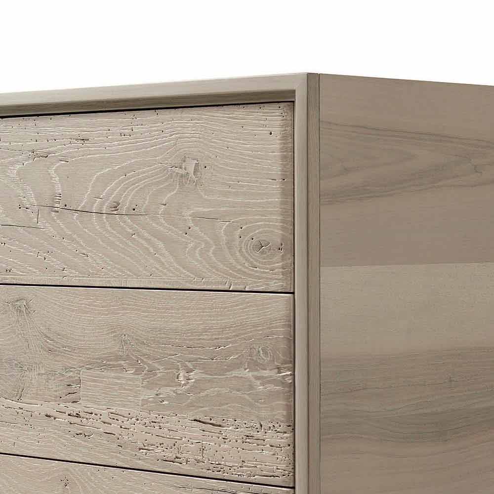 En detalle, el aspecto natural del tocador de 3 gavetas. El acabado de aceite preciso, que realza el grano de la madera, es el resultado de la artesanía hecha a mano realizada manualmente. La forma particular del mango agrega un toque de carácter y personalidad a los muebles.