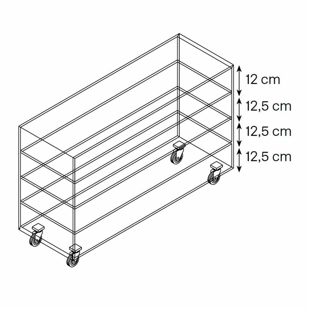 Realizado con una estructura en vidrio trasparente sobre ruedas con un estante y seis cajones contenedores en madera blanca.