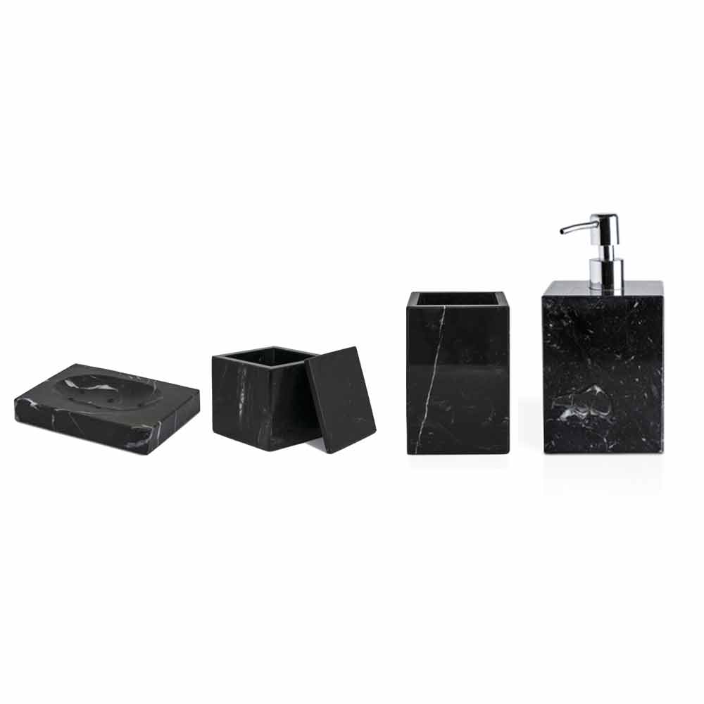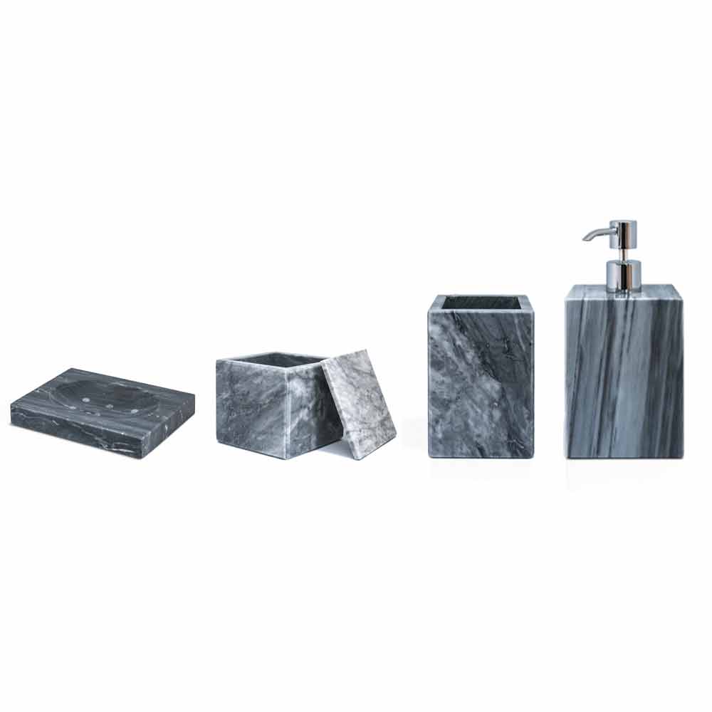 Maravillosa composición de accesorios de baño que incluye: soporte para jabón líquido, jabonera, soporte para cepillo de dientes y recipiente con tapa, y está disponible en 3 versiones.