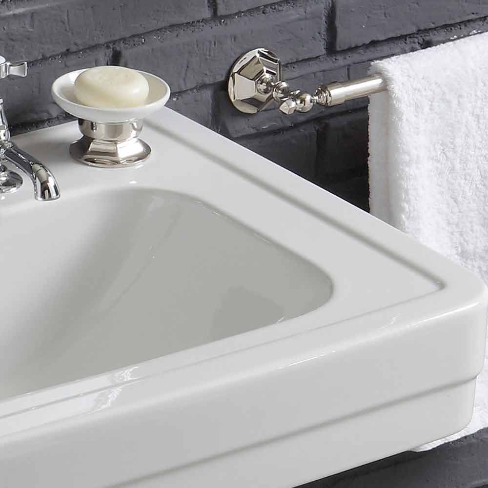 La línea también se completa y enriquece con la presencia de una hermosa y elegante jabonera independiente de cerámica con detalles cromados y un portacepillos de pared en el mismo diseño, todo ello completado por un elegante toallero de latón cromado.