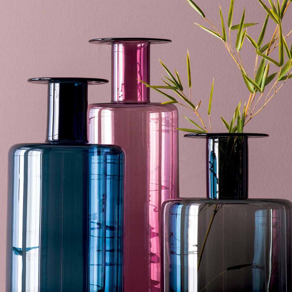 Composición de 3 jarrones modernos fabricados en vidrio coloreado.
