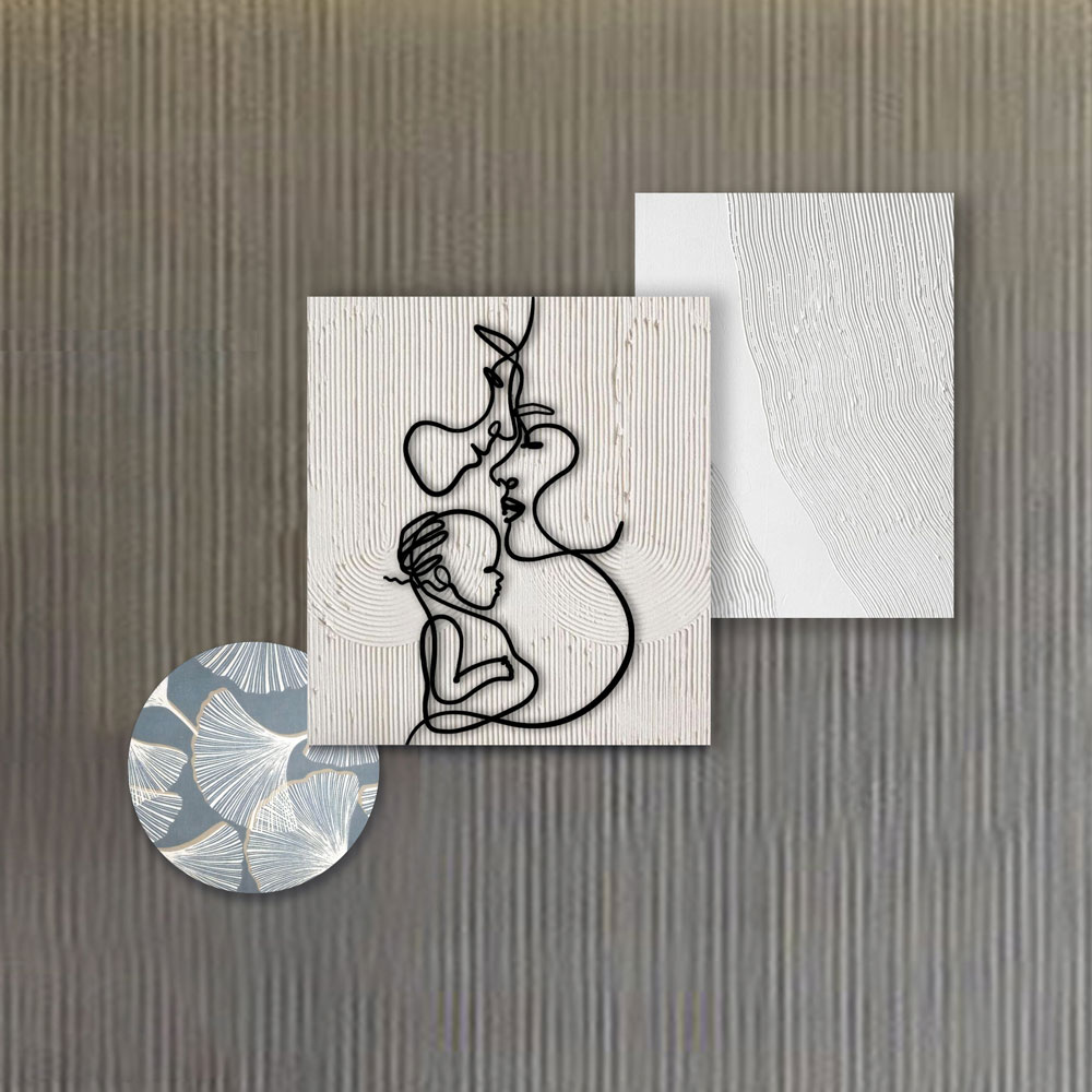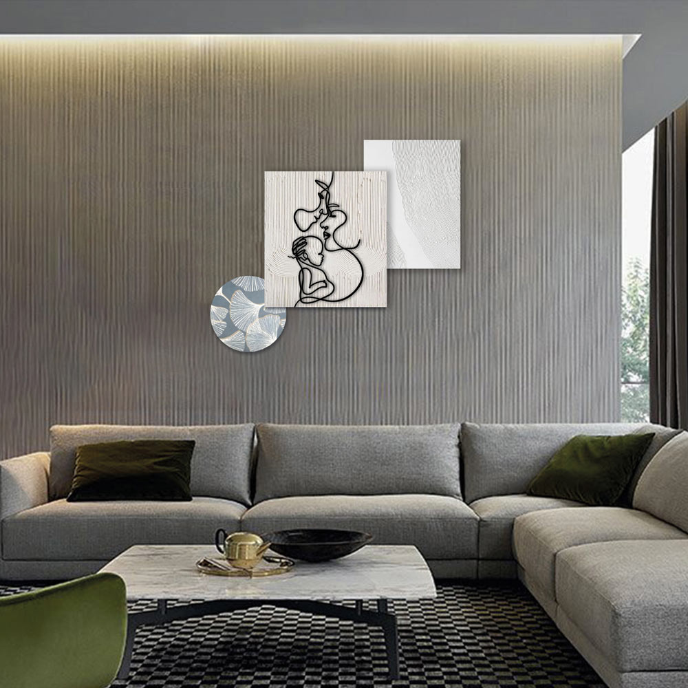 Composición de tres paneles de diferentes formas y tamaños que combinan decoraciones láser e impresas . Compuesto por tres paneles de madera estampada : uno redondo con pétalos blancos, uno rectangular que estiliza el amor de una familia y otro rectangular con líneas en alto relieve.