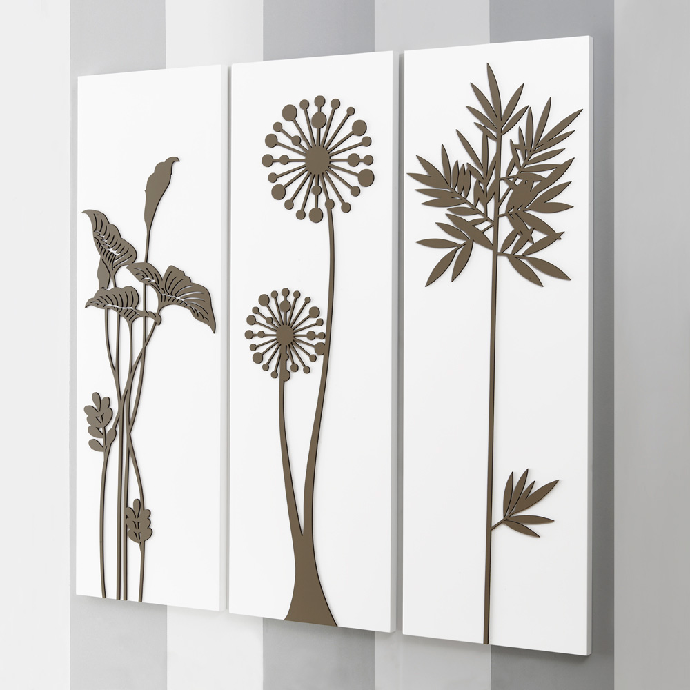 La composición de los paneles se realiza mediante la técnica de marcado láser que crea un bajorrelieve en el material, creando diferentes gradaciones de color creadas en el panel. El panel es de madera lacada en blanco con decoración gris tórtola . Representa flores y hojas estilizadas, que crean un trío esencial de paneles.