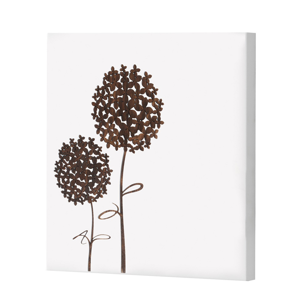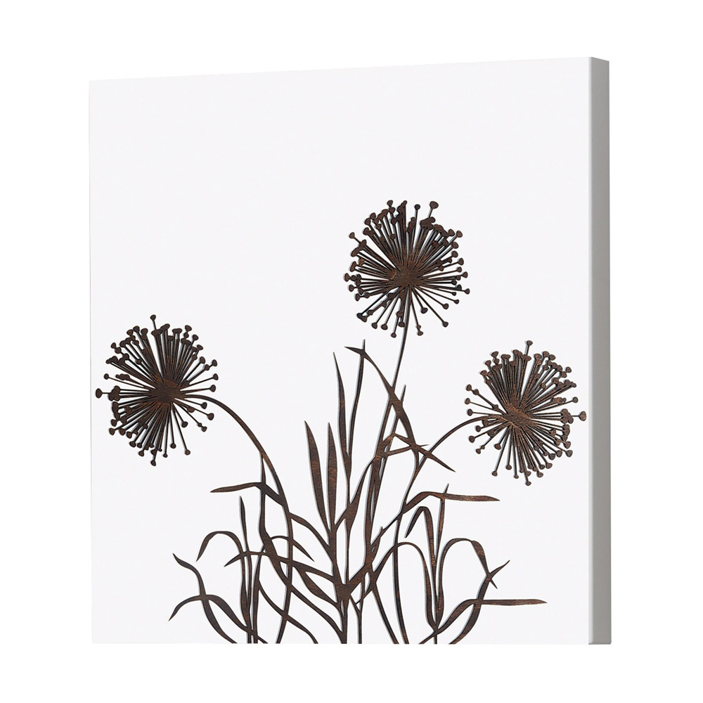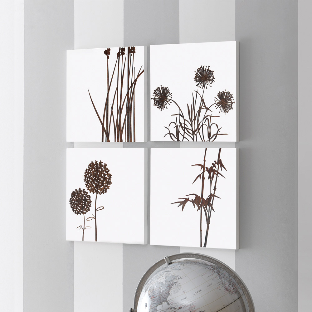 Composición de 4 paneles blanco mate con grabado o decoración en madera wengé cada uno representa hortensias, allium, thypa y caña de bambú.