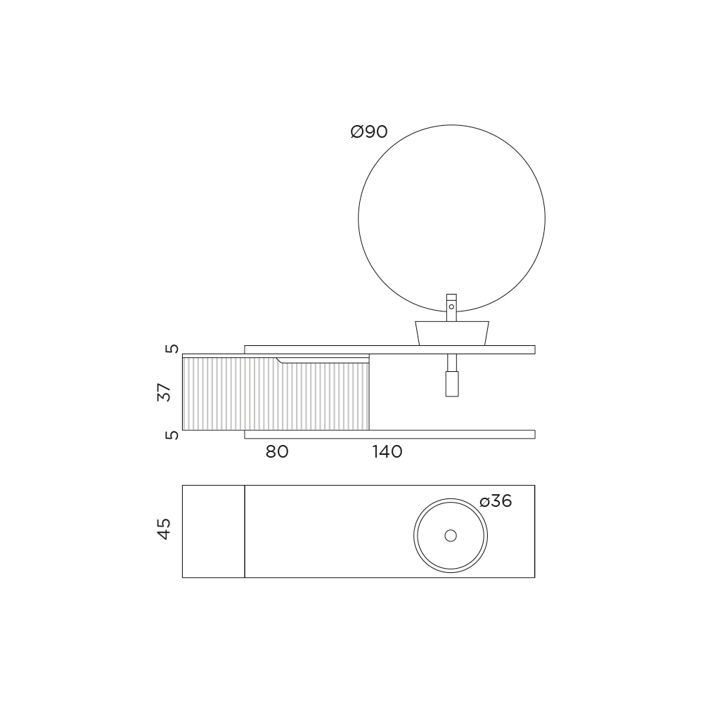 - Lavabo: Largo 36 x Fondo 36 x Alto 12 cm