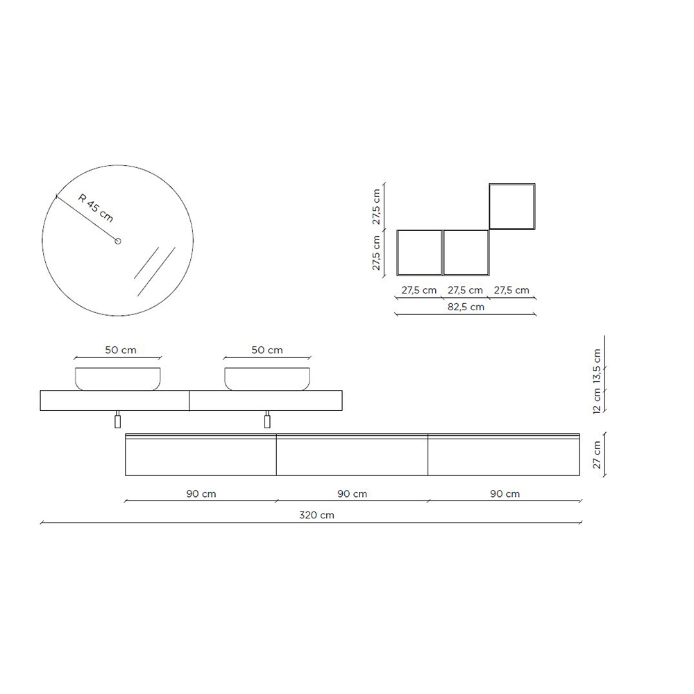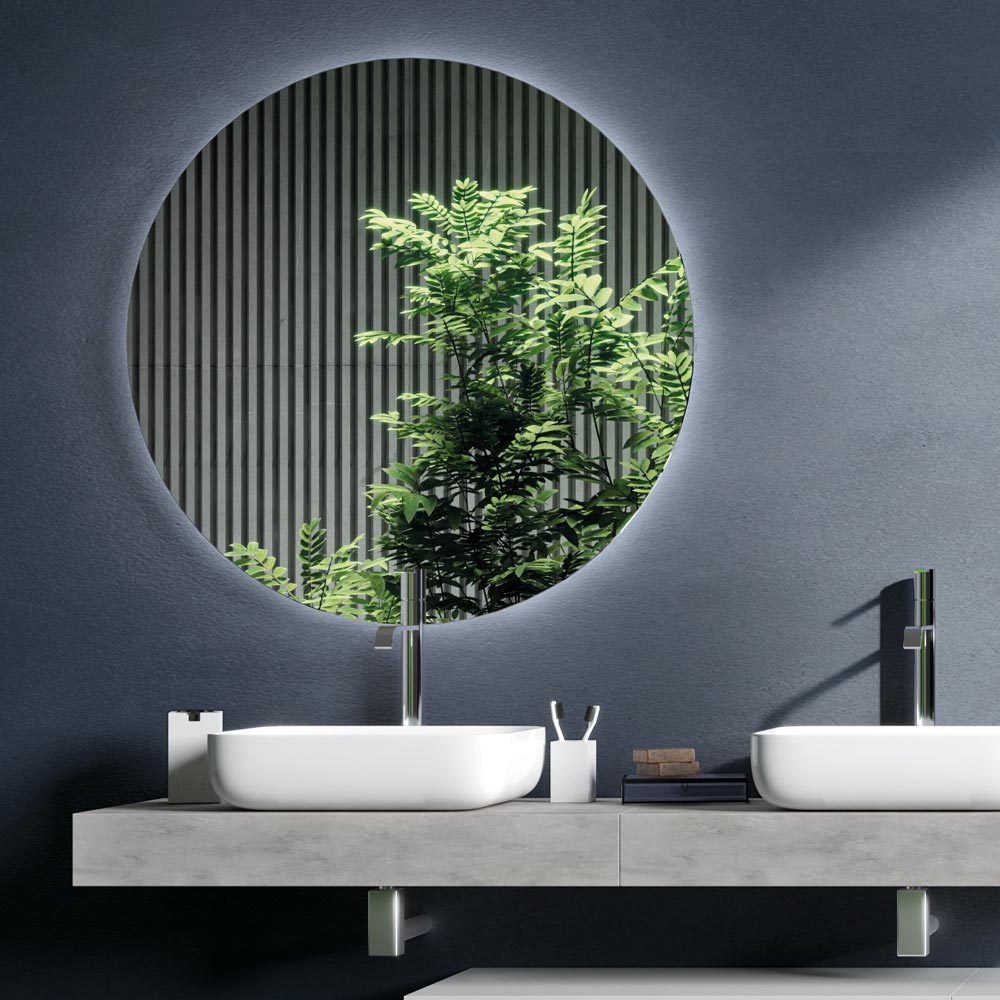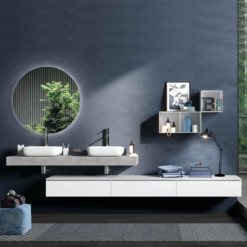 Composición de baño compuesta por: 2 lavabos de cerámica blanca brillo apoyados sobre dos encimeras de MDF revestido y HPL color cemento , una base en melamina antirrayas color blanco brillo y espejo redondo con LED perimetral.