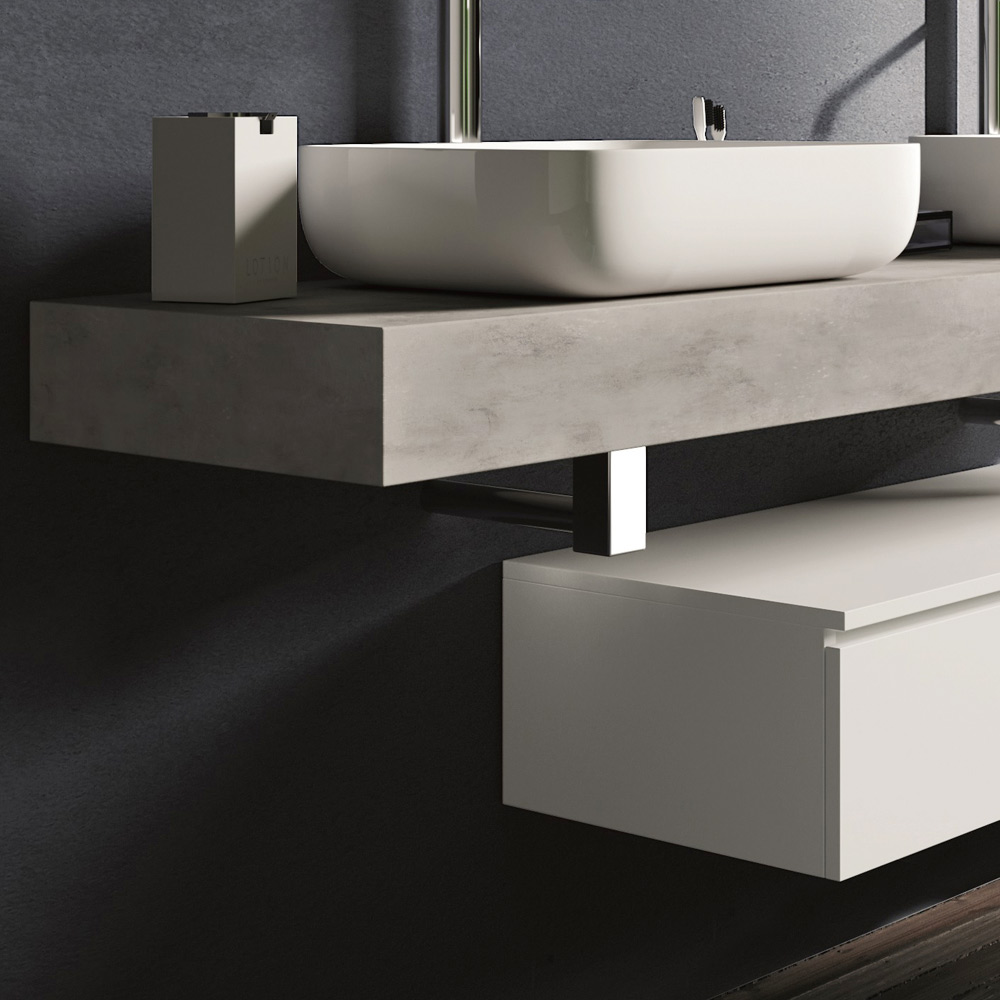 La composición de estilo moderno aporta al ambiente una atmósfera refinada y refinada. El ambiente del baño se enriquece con elegancia y permite diseñar infinitas combinaciones para expresar su identidad con un nuevo lenguaje.