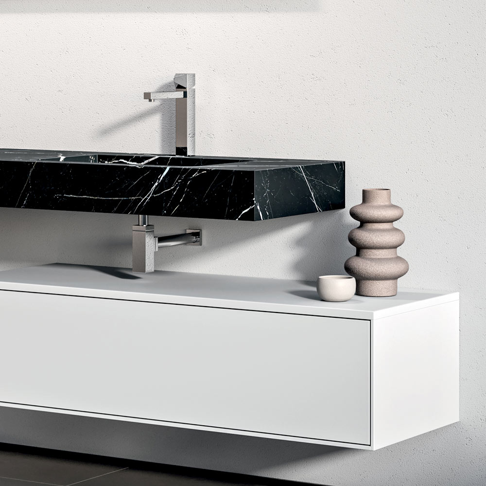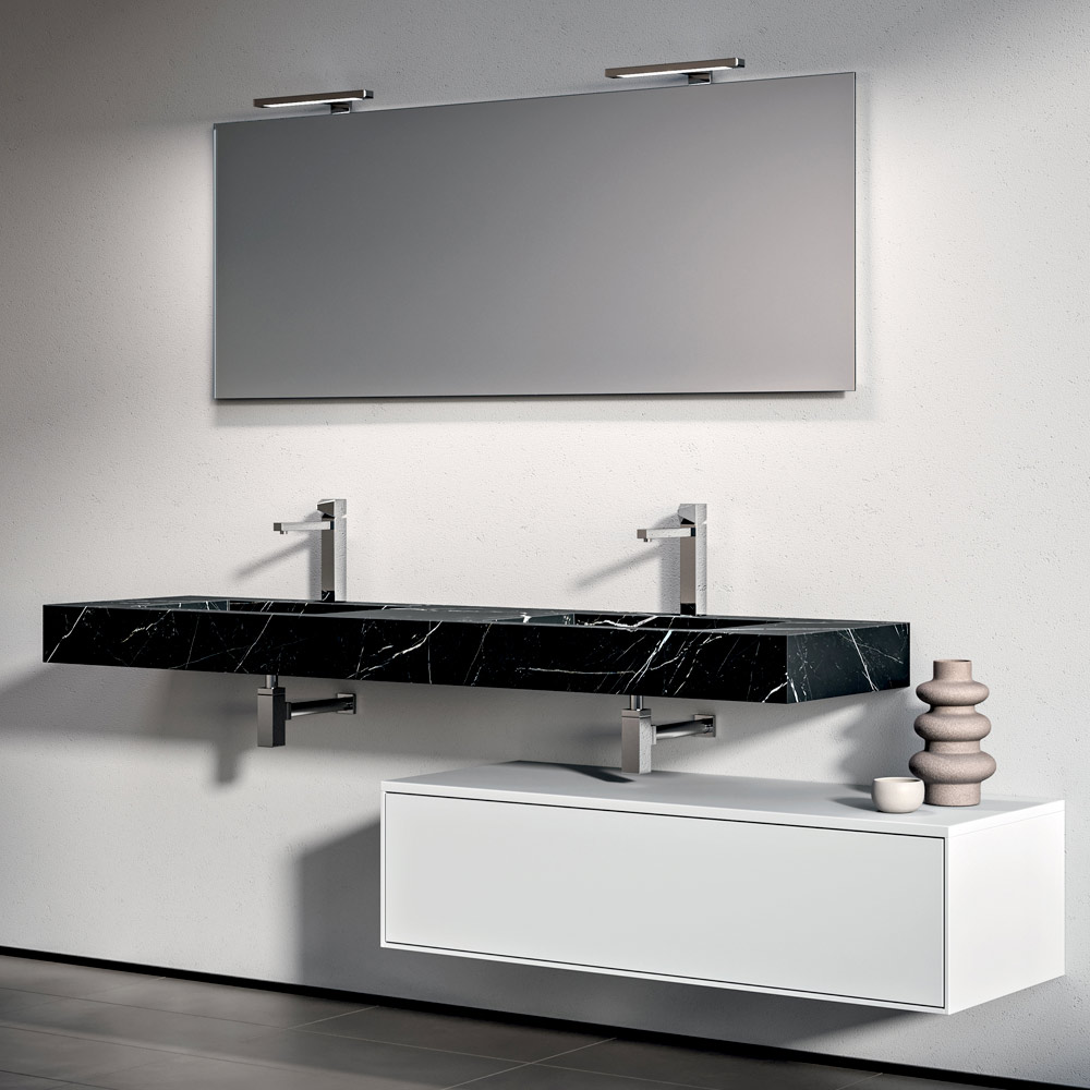 Una composición de baño dramática y contemporánea, diseñada para espacios amplios y sofisticados. La encimera de lavabo doble de HPL con efecto Marquina aporta carácter y profundidad visual, creando un refinado contraste con la base blanca mate .