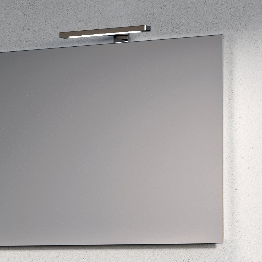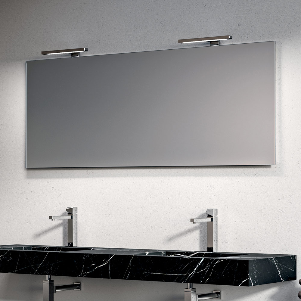 El espejo retroiluminado amplía visualmente el espacio y difunde una luz uniforme y envolvente, complementada por elegantes lámparas LED cromadas que aportan un toque luminoso y contemporáneo.