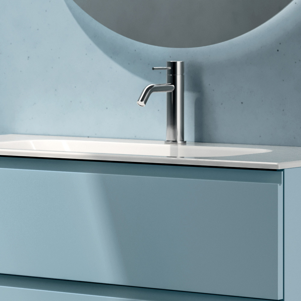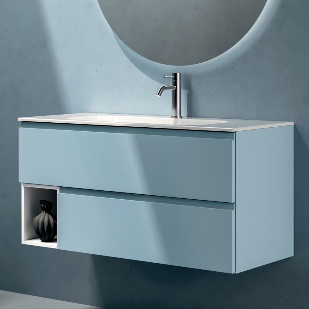 La composición ofrece una interpretación fresca y contemporánea del mobiliario de baño, caracterizada por volúmenes suspendidos, acabados mate y tonalidades delicadas que aportan luminosidad y ligereza al espacio.