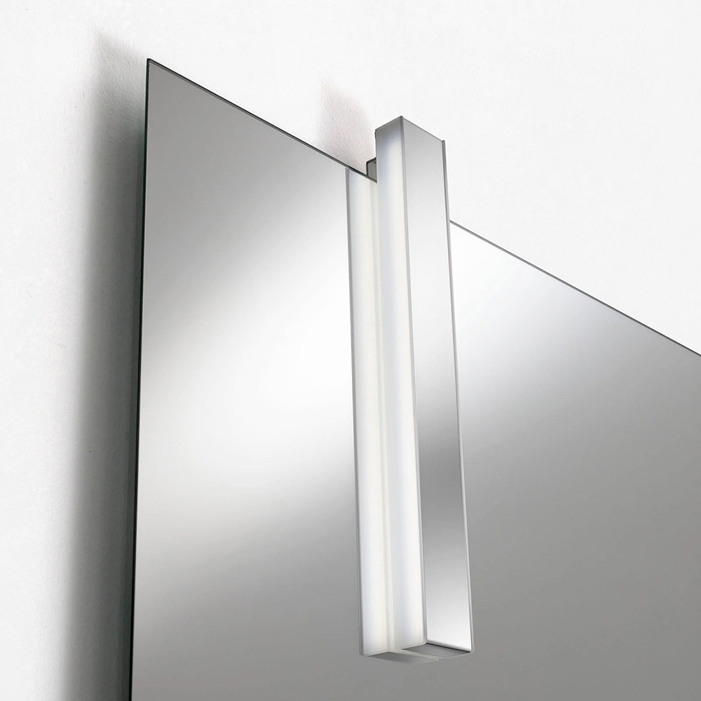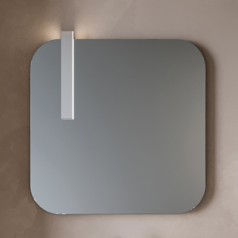 El espejo perfilado aporta carácter y personalidad a la composición, mientras que la lámpara LED con acabado cromado asegura una iluminación elegante y funcional, ideal para la zona del lavabo.