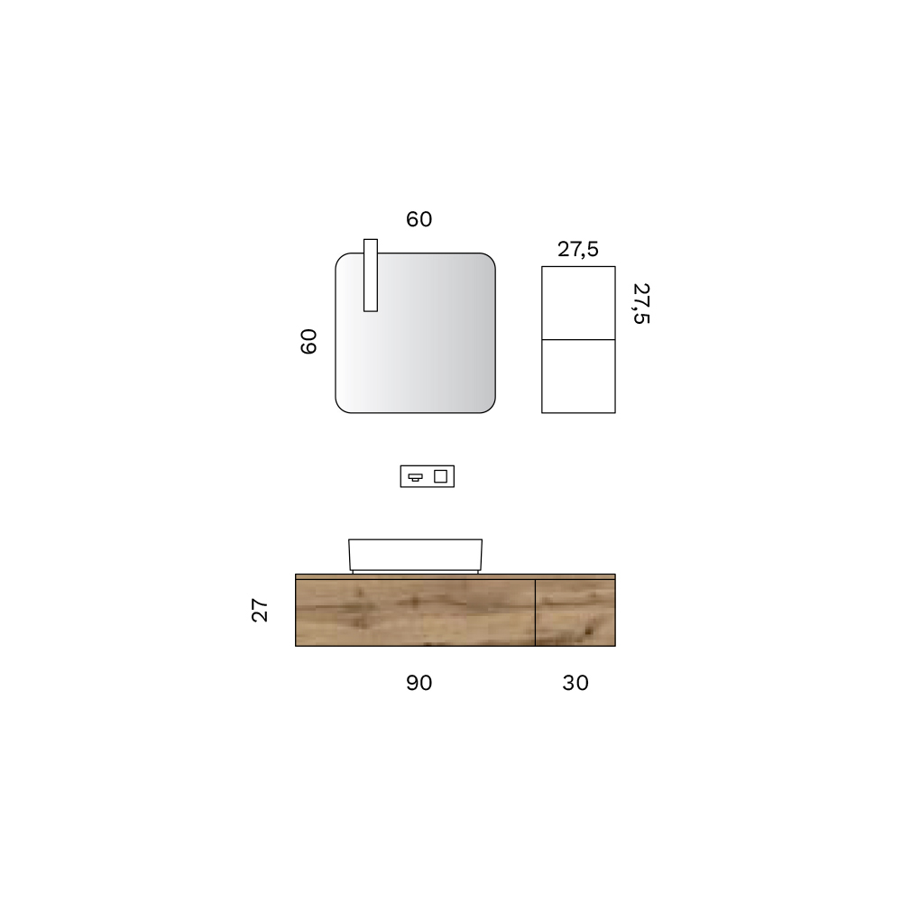 La estructura se compone de muebles bajos suspendidos con cajones , diseñados para garantizar una gestión funcional del espacio y una perfecta organización de los accesorios. El sifón integrado mantiene una línea limpia y minimalista, realzando el equilibrio formal del diseño general.