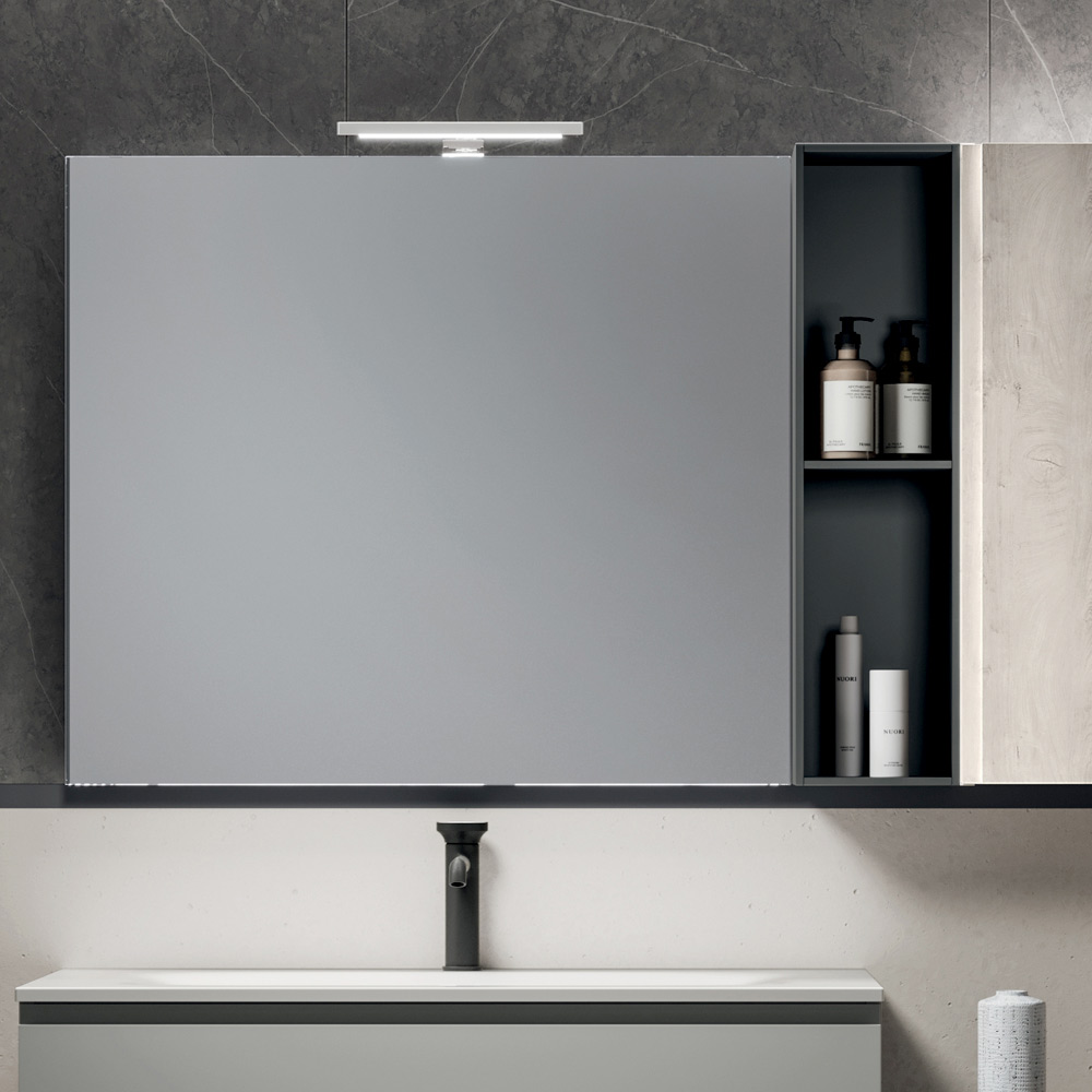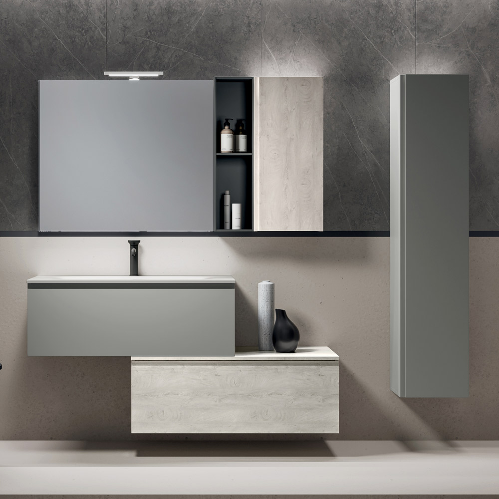 El mueble alto suspendido en acabado roble Alaska y el elemento abierto antracita enriquecen la estructura con soluciones funcionales y decorativas, ideales para organizar y personalizar el espacio del baño con elegancia y practicidad.