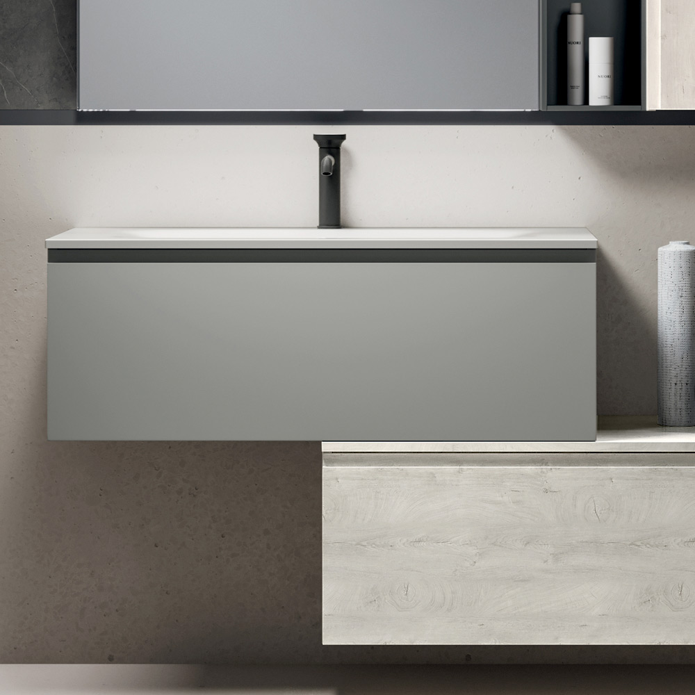 Los muebles bajos suspendidos con cesto , en los refinados acabados gris mate y roble Alaska , ofrecen una amplia capacidad de almacenaje y ayudan a mantener la estancia ordenada y visualmente luminosa.
