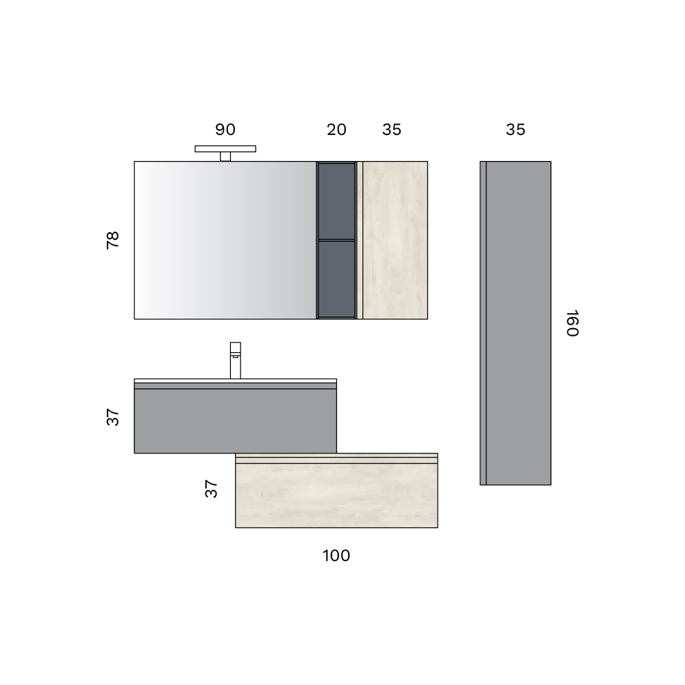 La composición interpreta el mobiliario de baño contemporáneo con un lenguaje arquitectónico minimalista, donde volúmenes sólidos y espacios abiertos conviven en perfecto equilibrio. Un diseño audaz, ideal para espacios modernos y elegantes.