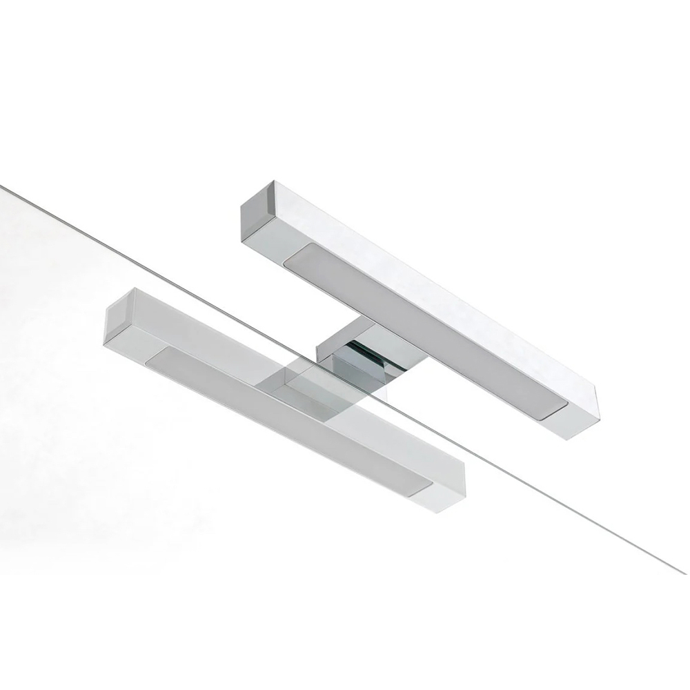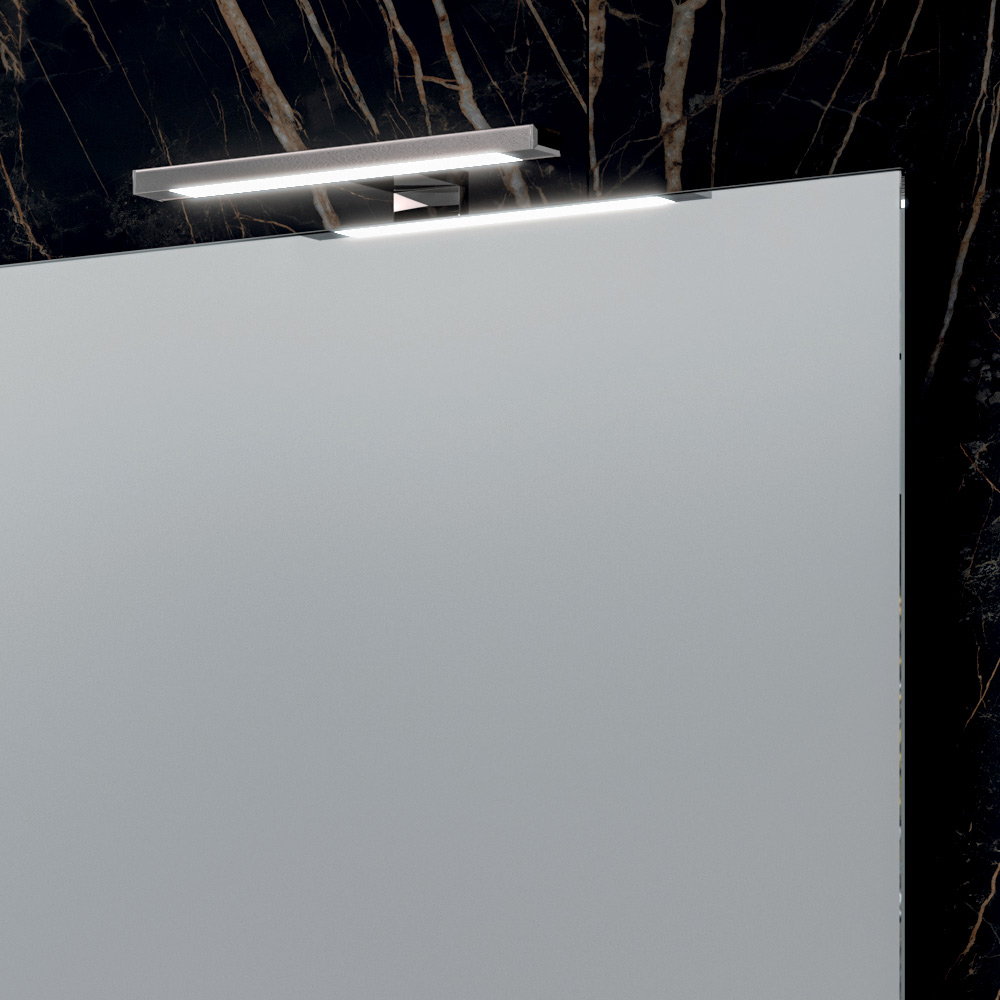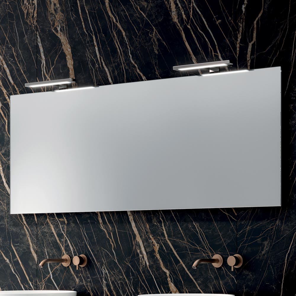 El espejo rectangular amplifica la luminosidad y da profundidad al espacio, mientras que las lámparas LED con acabado cromado añaden una iluminación elegante y funcional, perfecta para realzar la zona del lavabo.