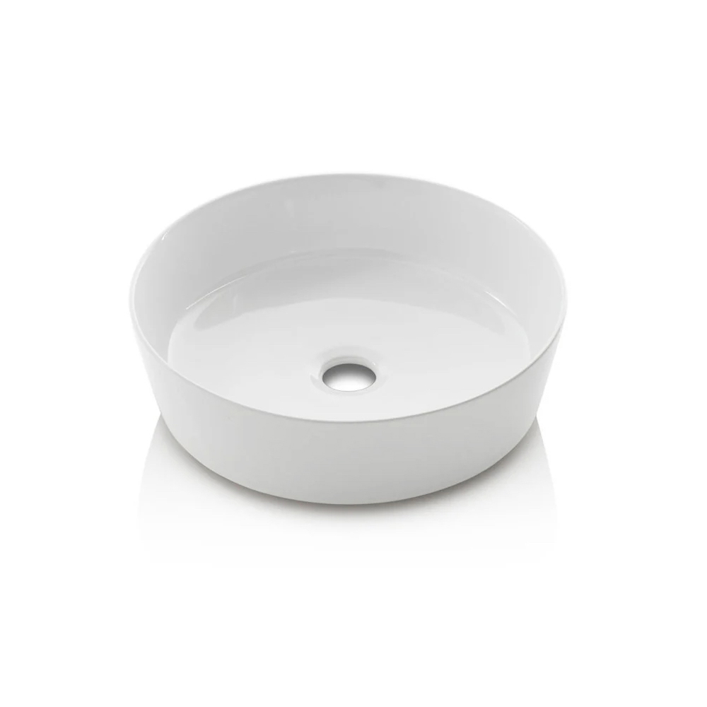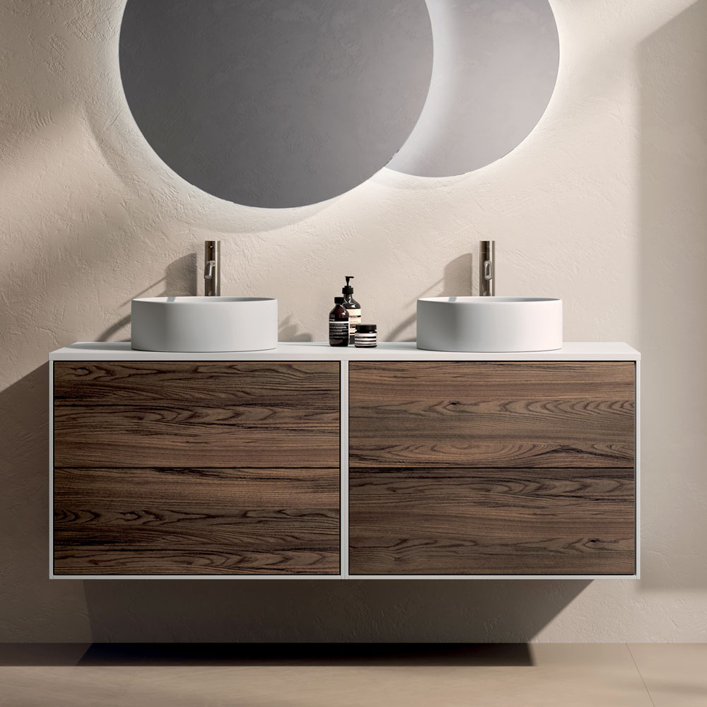 Los lavabos redondos de cerámica blanca brillante emergen con elegancia de la superficie, realzando la ligereza visual del diseño general y ofreciendo una solución ideal para espacios compartidos. Las formas suaves interactúan armoniosamente con las líneas limpias del mueble suspendido.