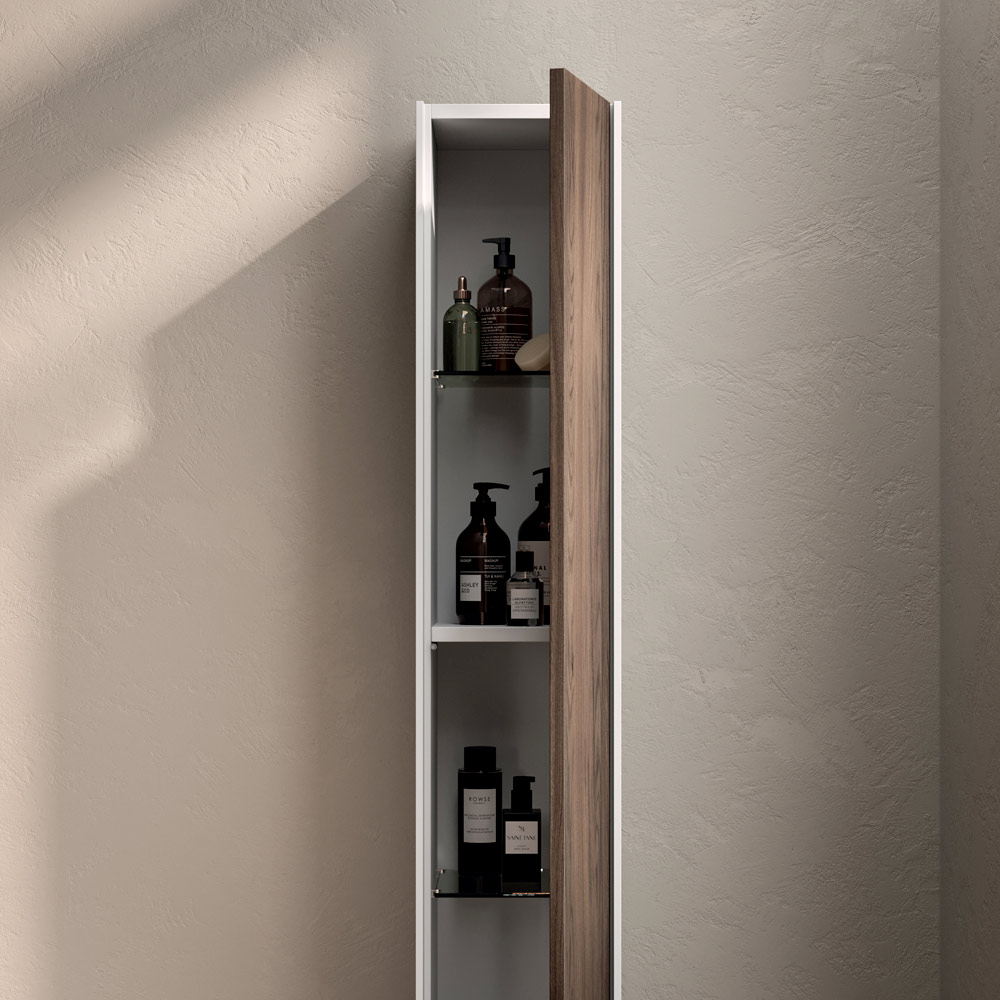 Una composición de baño de fuerte impacto visual, caracterizada por la calidez matérica del roble Río y la pureza de la encimera blanca mate , que juntos crean un refinado equilibrio entre naturalidad y minimalismo contemporáneo.