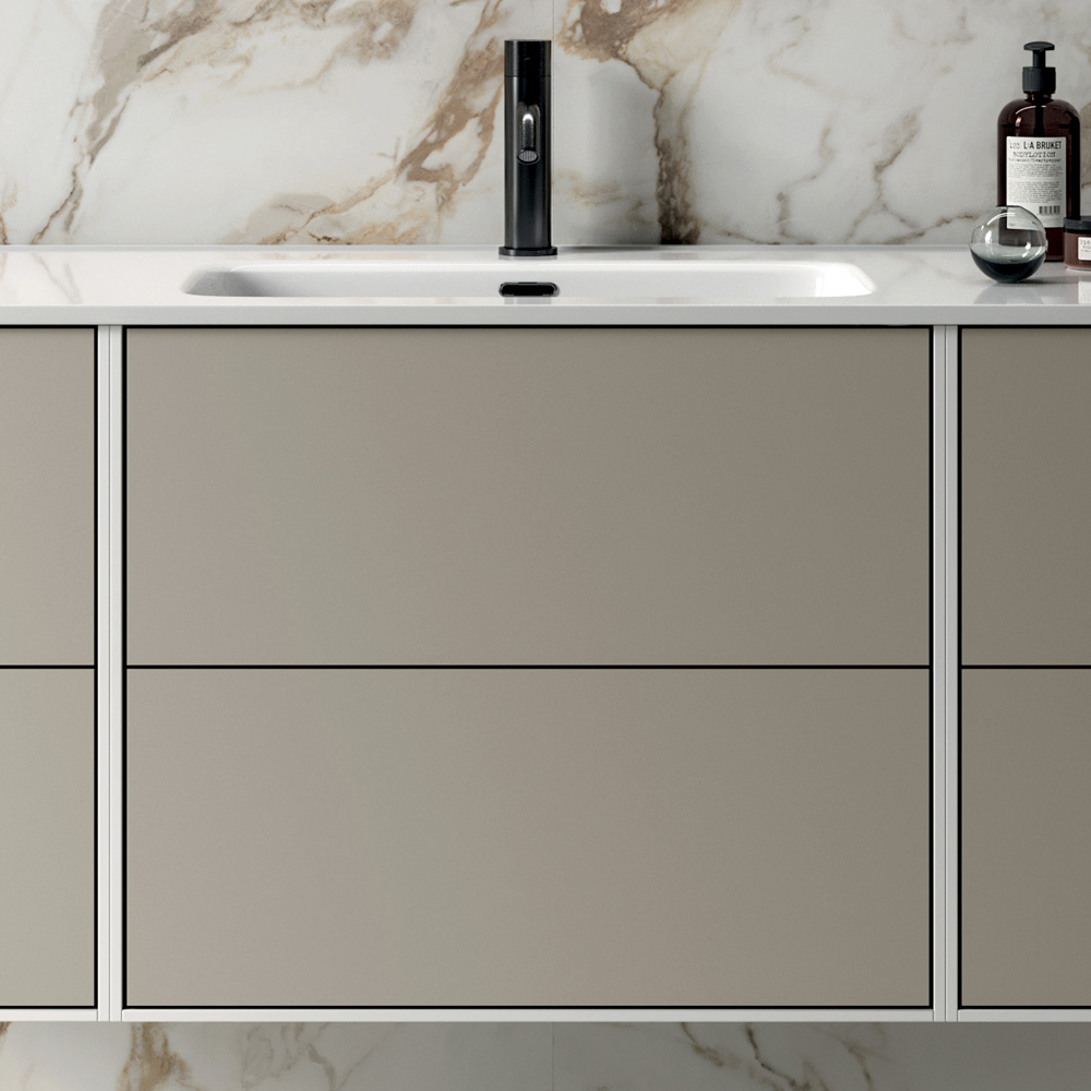 Las líneas esenciales y los volúmenes limpios realzan el espacio, mientras que la configuración suspendida aporta ligereza visual y un refinado efecto arquitectónico. Los cajones ofrecen practicidad y orden, manteniendo una estética minimalista y armoniosa.