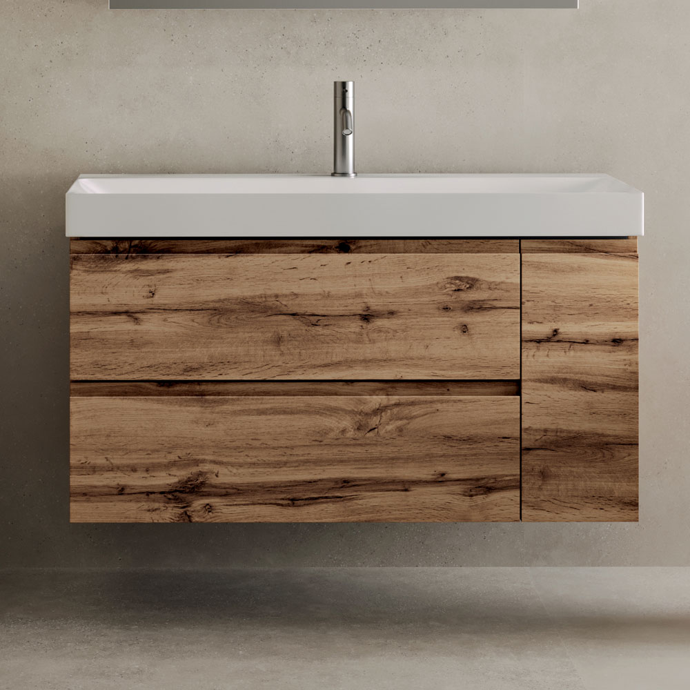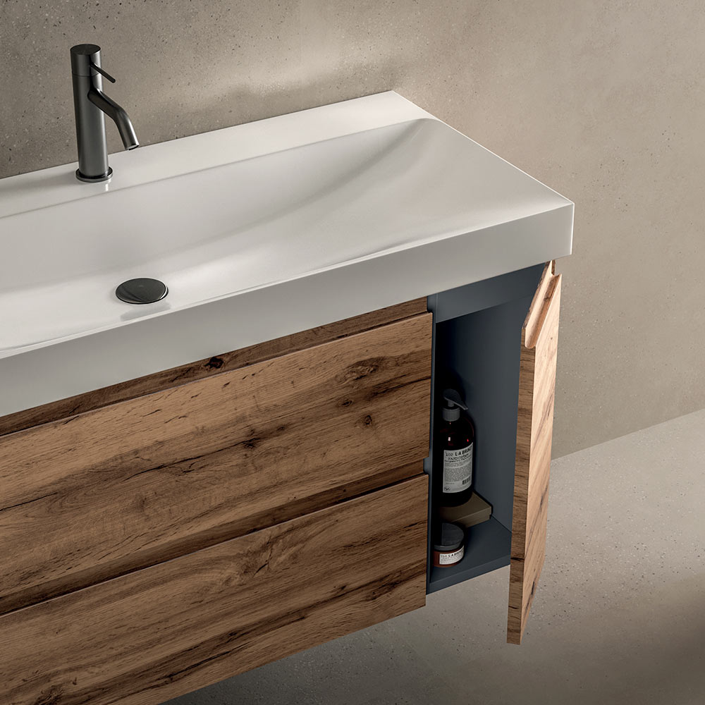 El mueble base con dos cajones y puerta lateral ofrece almacenamiento funcional, garantizando practicidad para el día a día y una estética impecable. Las líneas limpias y el diseño suspendido aligeran visualmente el baño.