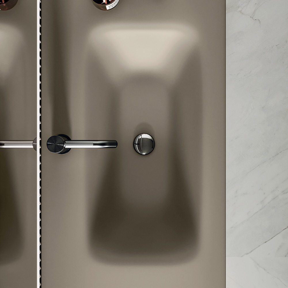 El lavabo de cristal satinado en color gris tórtola crea un refinado juego tono sobre tono con la base, realzando la ligereza visual de toda la composición y dando luminosidad a la zona del lavabo.