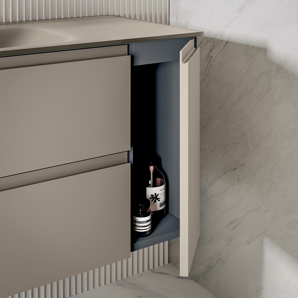 El mueble base de 120 cm con dos cajones y puerta a la derecha, en acabado gris paloma mate, ofrece una amplia capacidad de almacenamiento, manteniendo una estética refinada y contemporánea. La configuración de puertas integradas garantiza una mayor funcionalidad y organización del espacio interior.