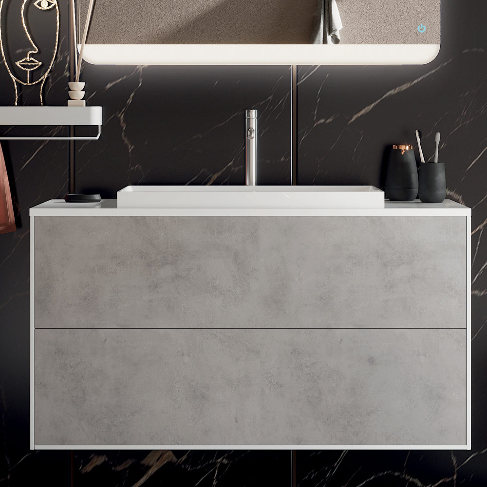 Composición de baño completa con lavabo encastrable de resina , espejo de cristal con LED frontal y perimetral y base de melamina antirrayas color cemento con 2 cajones totalmente extraíbles y cierre suave.