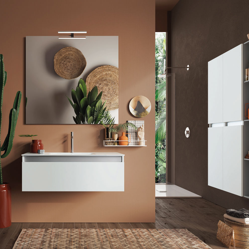 Composición de baño con lavabo de resina blanco brillo, espejo reversible con marco de ABS retráctil con lámpara, base suspendida en melamina antirrayas blanco brillo con cajón totalmente extraíble y cierre suave.