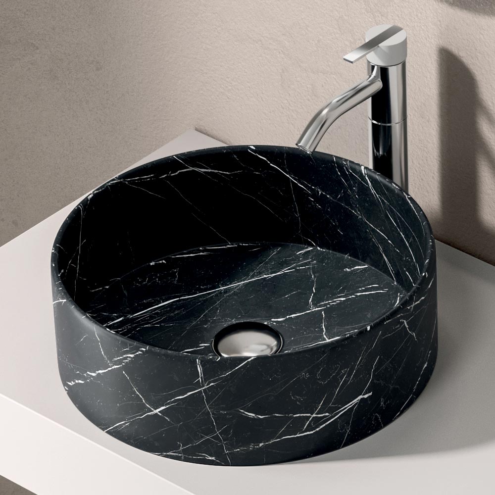 El lavabo de cerámica efecto Marquina , de líneas suaves y fuerte impacto matérico, introduce un elegante contraste cromático que embellece el conjunto y subraya su carácter sofisticado.