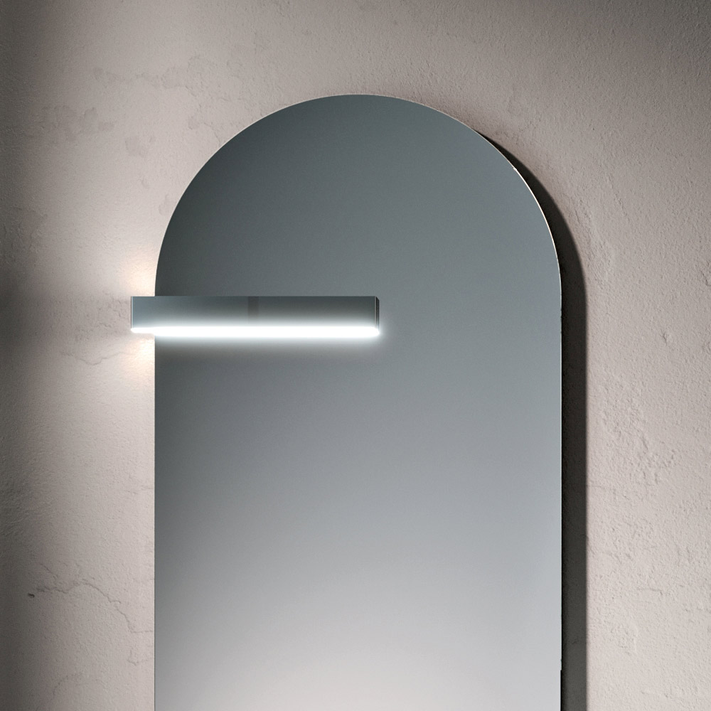 El espejo , combinado con la iluminación LED decorativa y la lámpara colgante, completa la composición, creando una atmósfera íntima y refinada, ideal para un baño moderno y escénico.