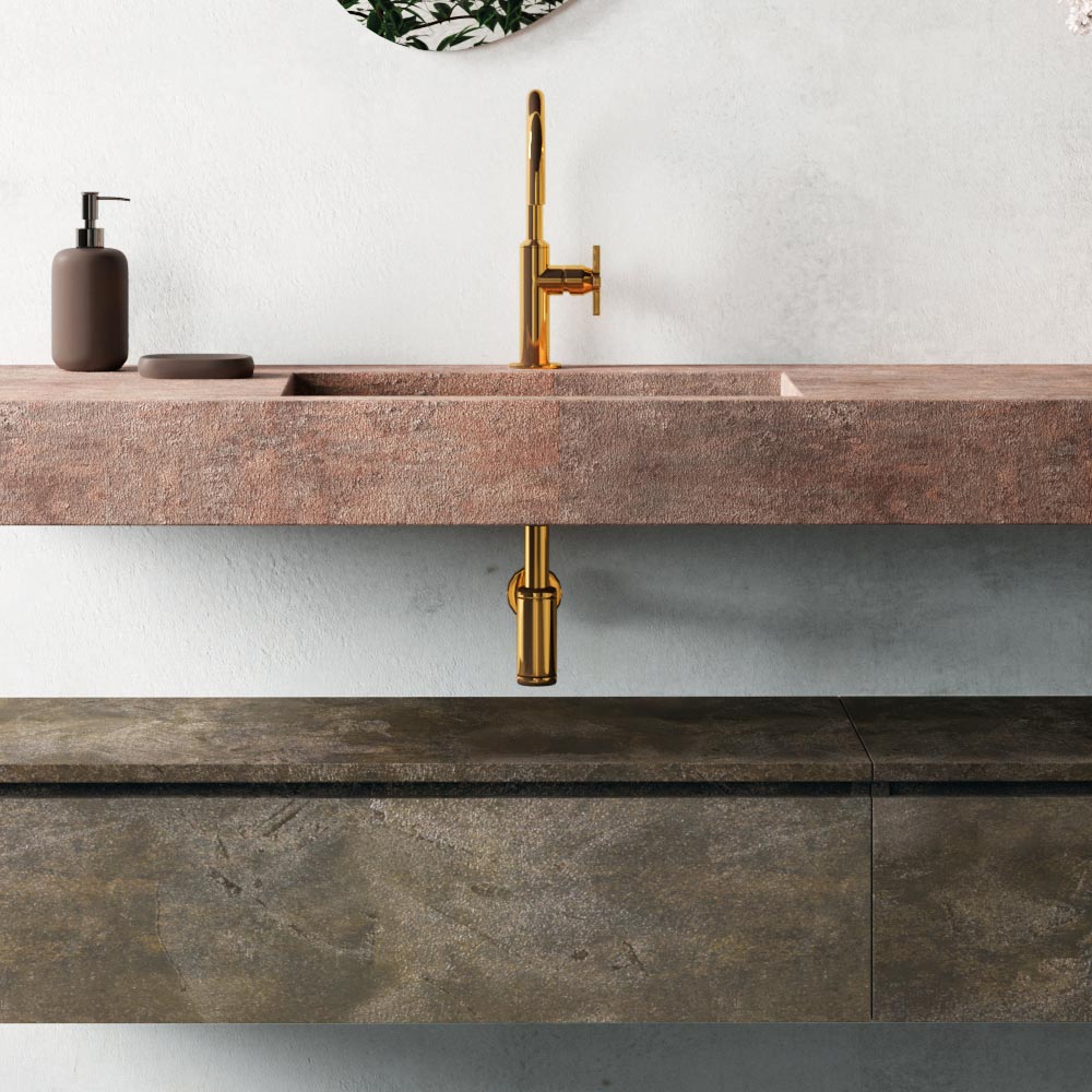 Composición de baño compuesta por espejo de estilo moderno y lavabo consola en color corten Base color piedra de lava.