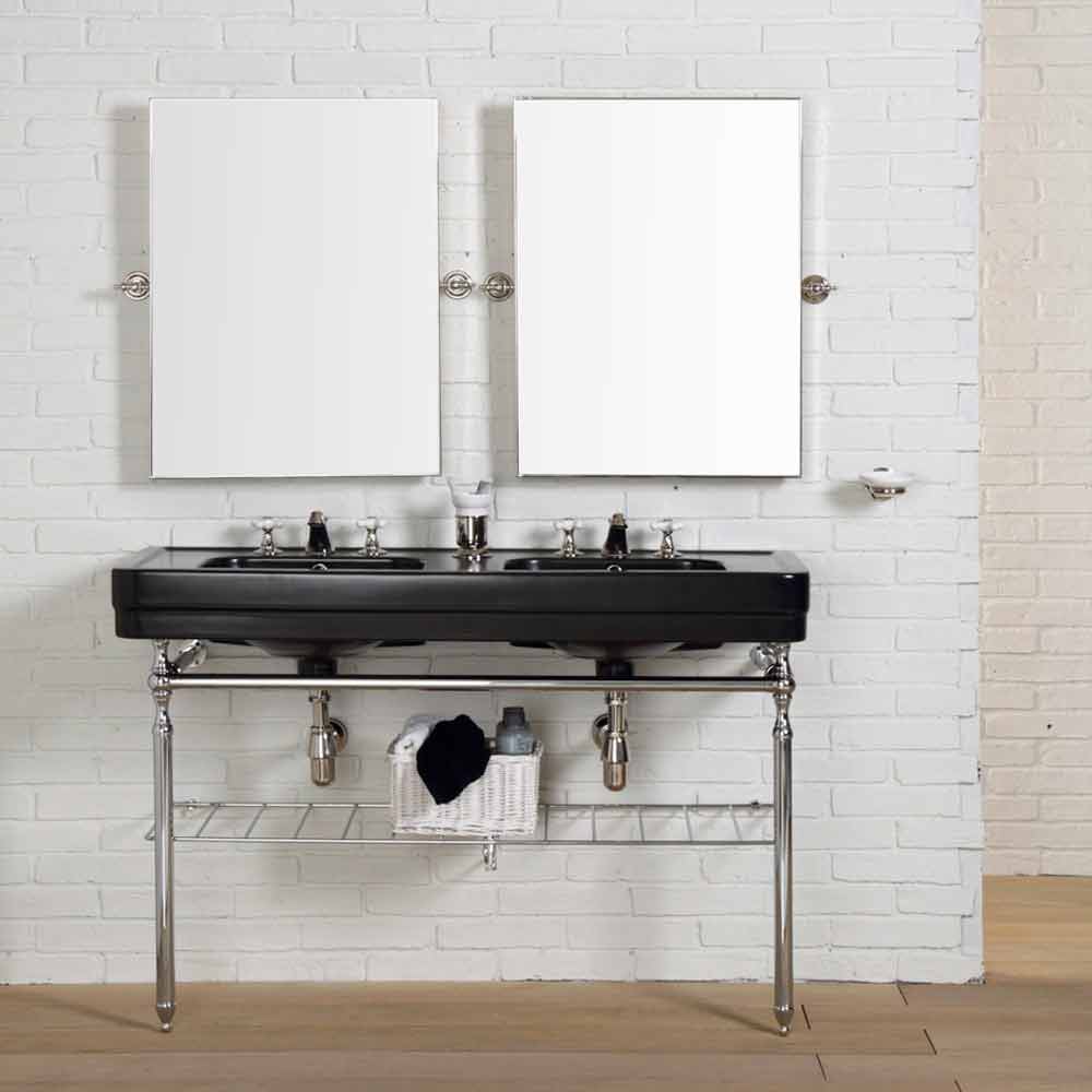 Partes incluidas en la composición: - Lavabo doble L.130 cm x P.51 cm, en acabado negro mate RAL 9011 - Base de metal cromado + rejilla base cromada L.130 cm x h. 76 + 13 cm x 51 cm de voladizo de pared - 2 juegos de grifos de porcelana con desagüe - 2 sifones de cromo - 2 desagües - 2 espejos rectangulares basculantes con marco de metal de latón cromado de 76,5 cm x 57,5 cm. - Soporte para cepillo de dientes independiente - Jabonera de pared cromado