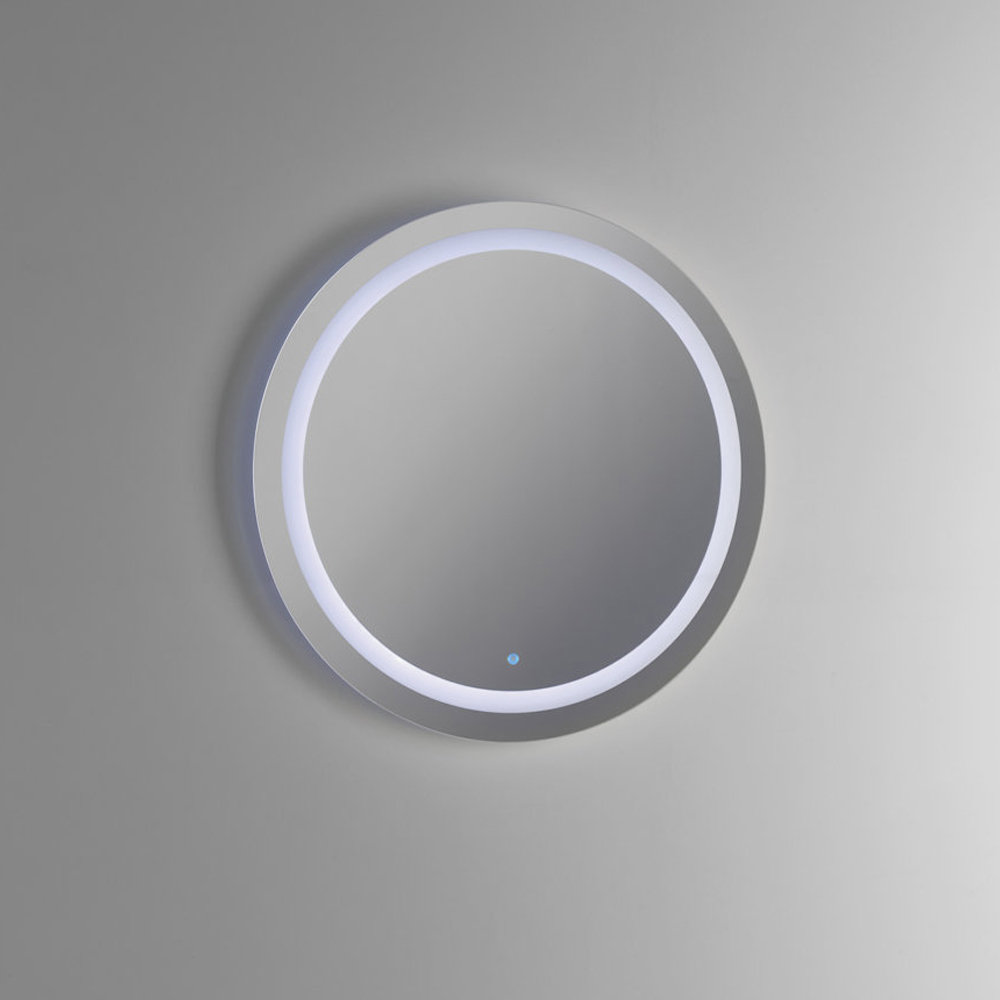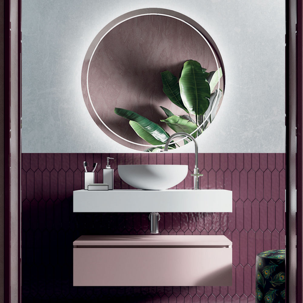 Composición de baño íntegramente fabricada en Italia compuesta por una base con cajón en resina rosa claro, Encimera de MDF revestido y HPL blanco , lavabo de resina blanca brillo y espejo redondo de cristal con LED táctil .