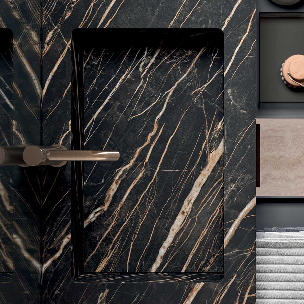 El lavabo sobre encimera de gres, con acabado efecto piedra oscura, añade una fuerte identidad material y garantiza altas prestaciones en términos de resistencia y durabilidad, haciéndolo perfecto para el uso diario.