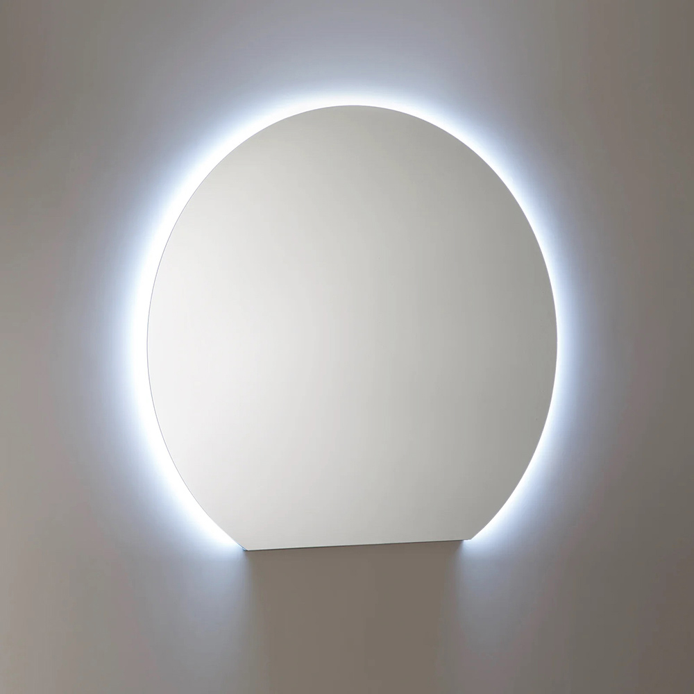 Completando la composición, el espejo circular con iluminación LED integrada da profundidad al espacio y mejora el aprovechamiento de la zona del lavabo, creando un ambiente acogedor y sofisticado.