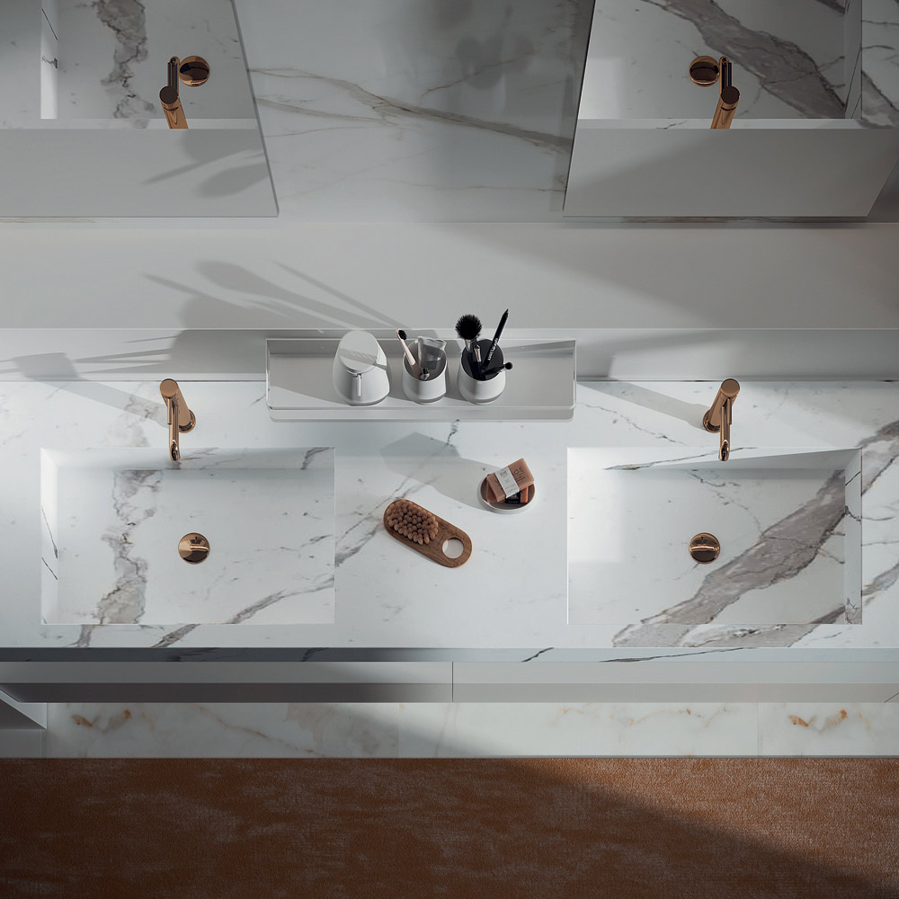 Composición con un estilo moderno y sumamente elegante que responde a las necesidades de diseño de quienes quieren hacer único su baño. El refinamiento de los acabados y la calidad de los materiales utilizados para crear toda la composición crean un producto de gran funcionalidad y diseño.