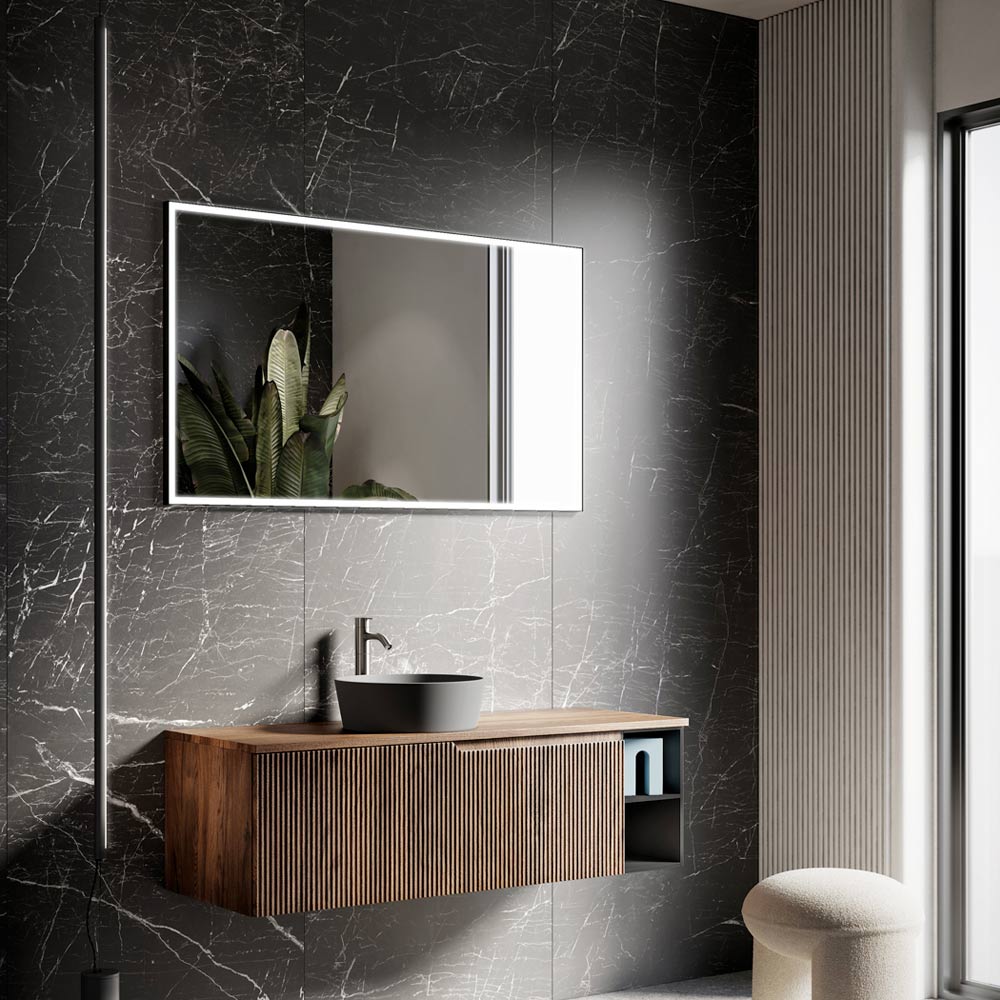espejo con luz LED frontal y marco negro.