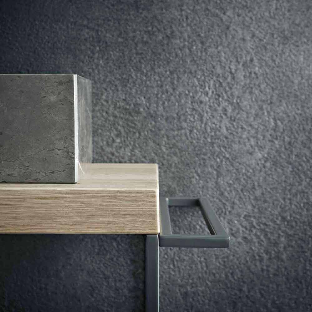 La composición es en roble natural anudado , lavabos en piedra gris , estructuras metálicas en lacado gris oscuro mate. Mueble alto en lacado gris oscuro mate.