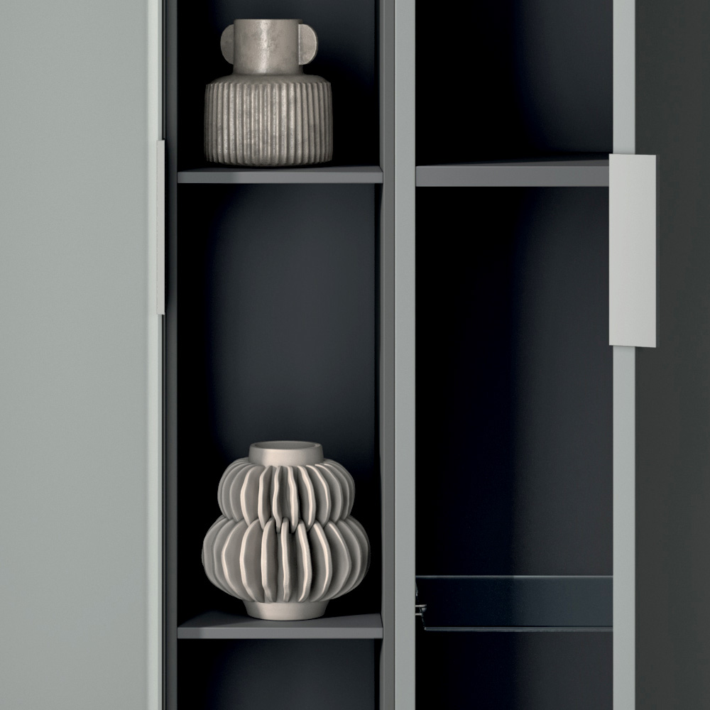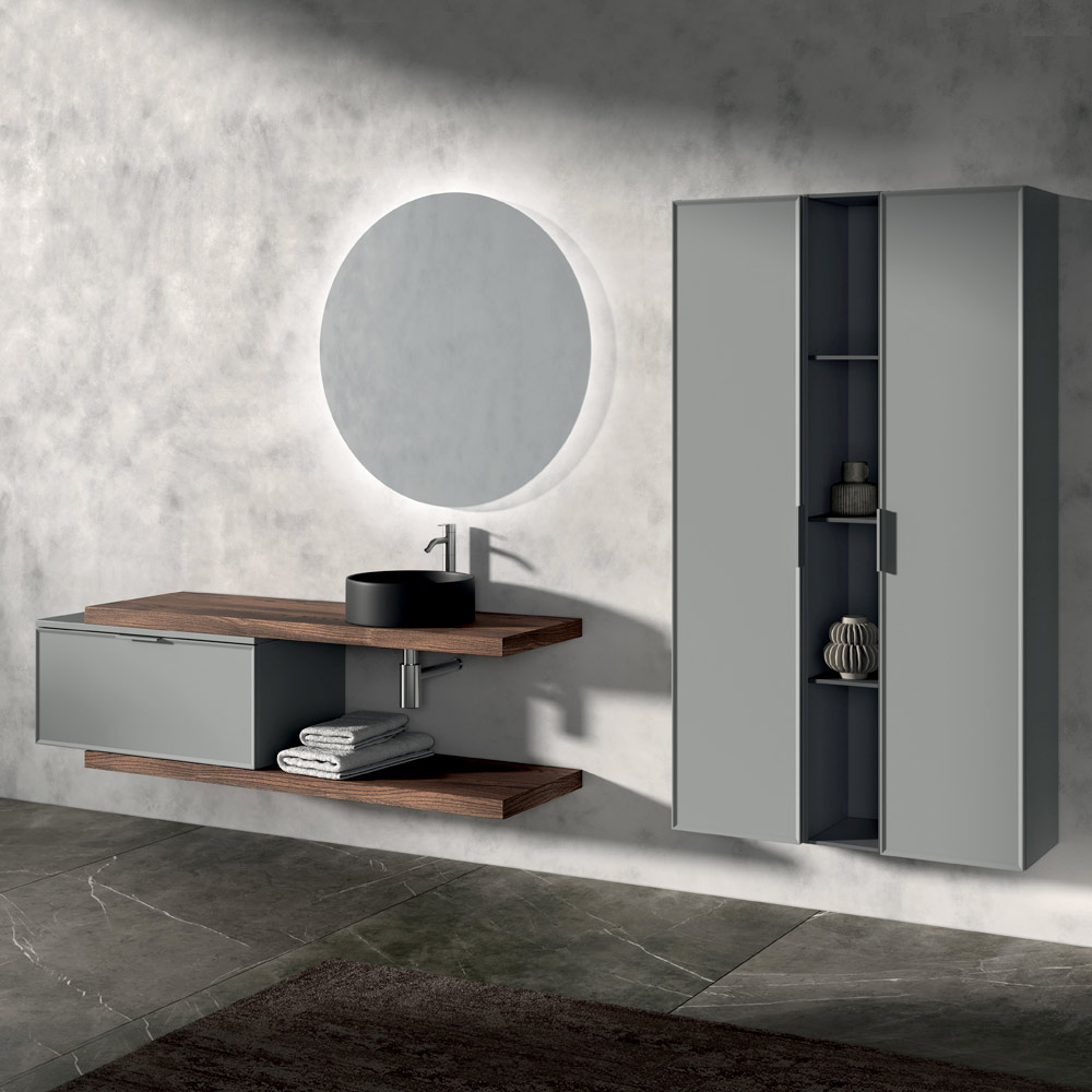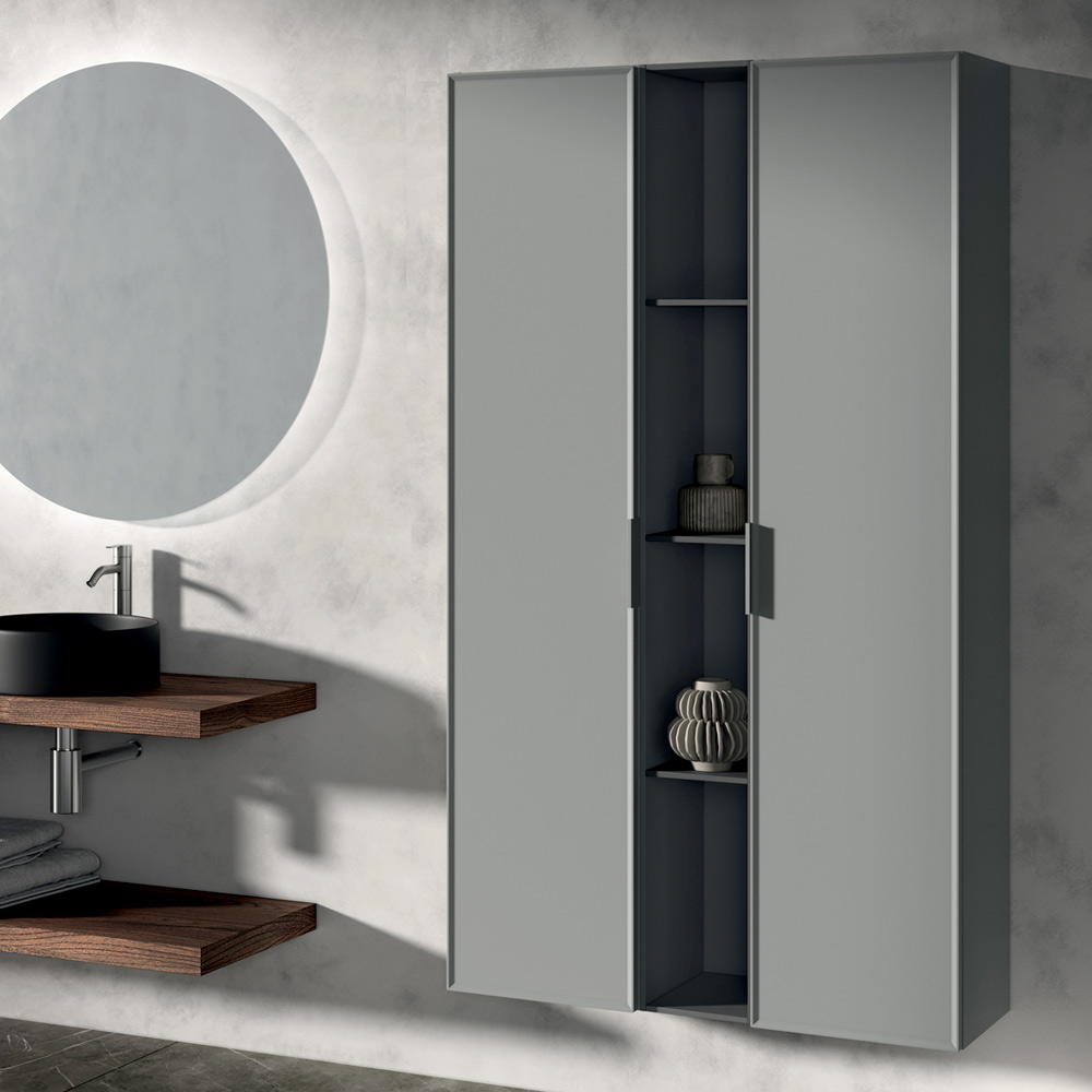 La composición se enriquece con columnas de almacenaje verticales y un elemento abierto de color antracita , perfecto para organizar accesorios y objetos manteniendo un estilo ordenado y contemporáneo.