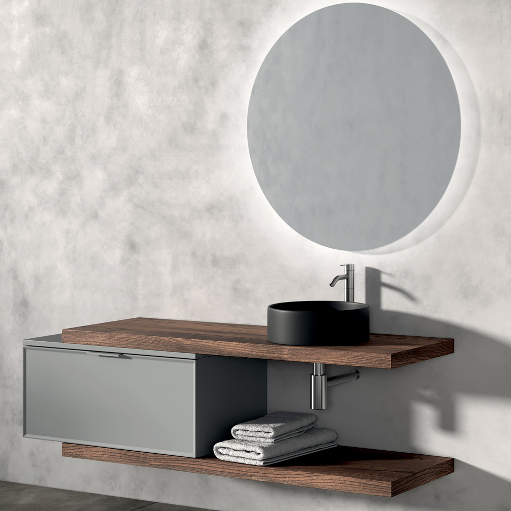 Las 2 encimeras de roble Río introducen un elemento natural y cálido, creando un agradable contraste matérico con el lavabo de encimera redondo de cerámica negra mate , auténtico protagonista visual de la composición.