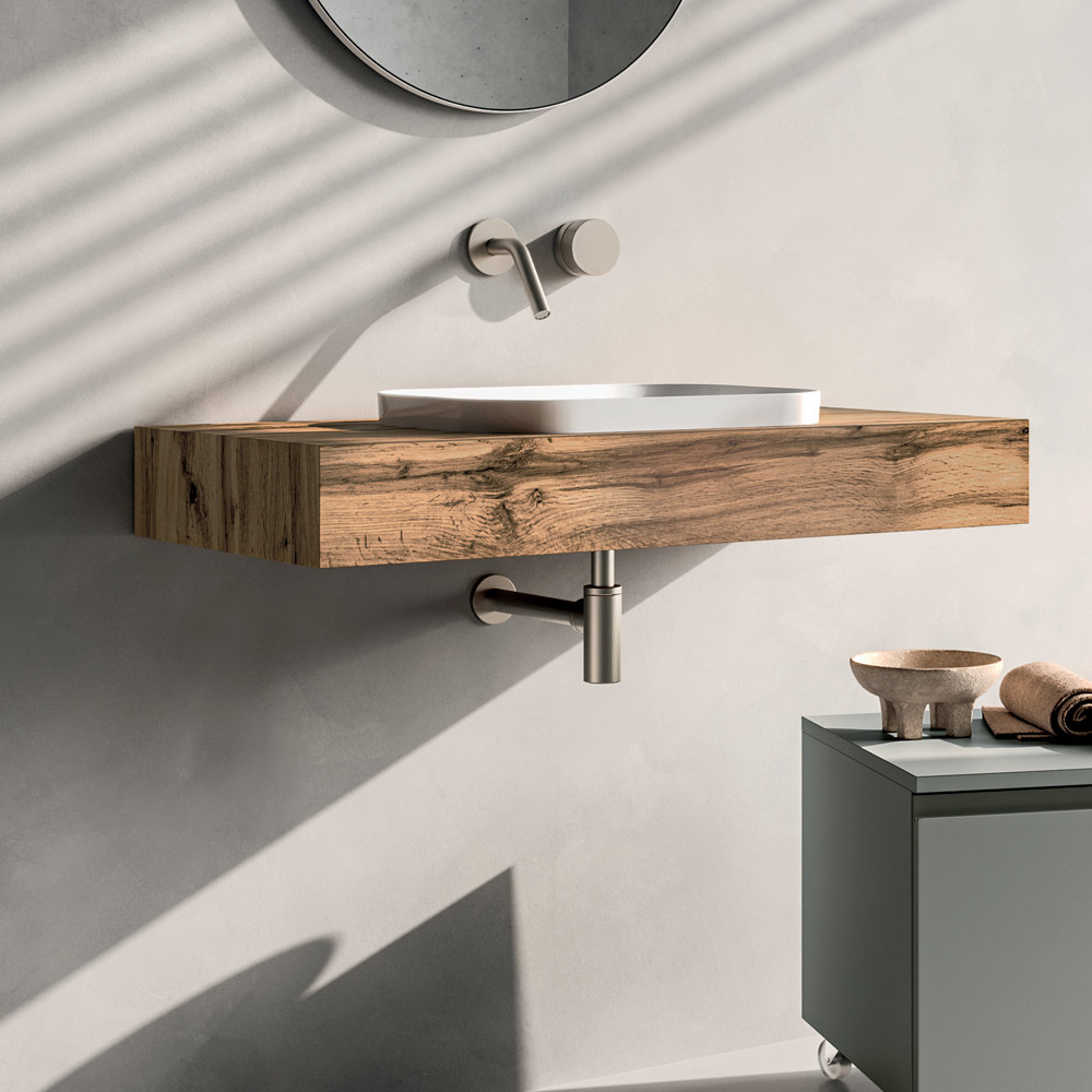 El tablero del estante con soportes de roble a la vista introduce un elegante contraste de materiales, creando un equilibrio armonioso entre superficies cálidas y volúmenes esenciales. Una elección que aporta carácter y personalidad a toda la composición.
