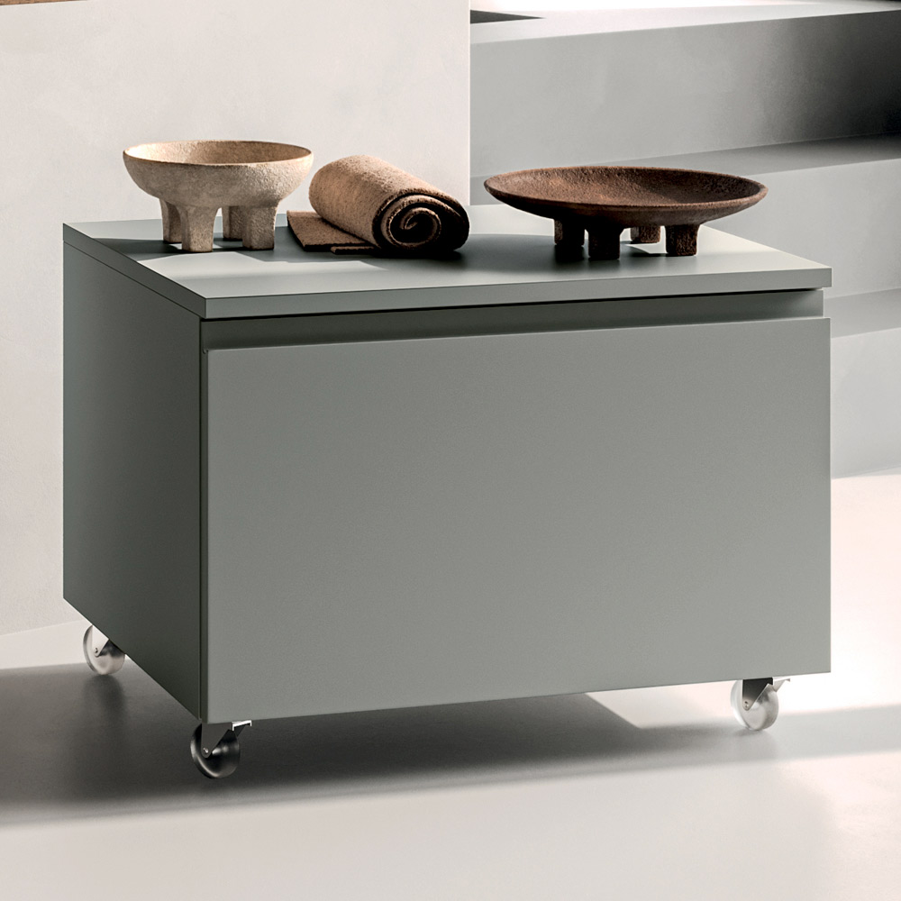 La unidad base con cajón ofrece un almacenamiento práctico y bien organizado, ideal para mantener el espacio ordenado sin sacrificar la estética. El acabado gris mate le da un aspecto texturizado y contemporáneo que complementa fácilmente diversos estilos de decoración. Para mayor versatilidad, las ruedas permiten una gestión flexible del espacio, ideal para baños modernos, proyectos contract o soluciones de mobiliario originales.