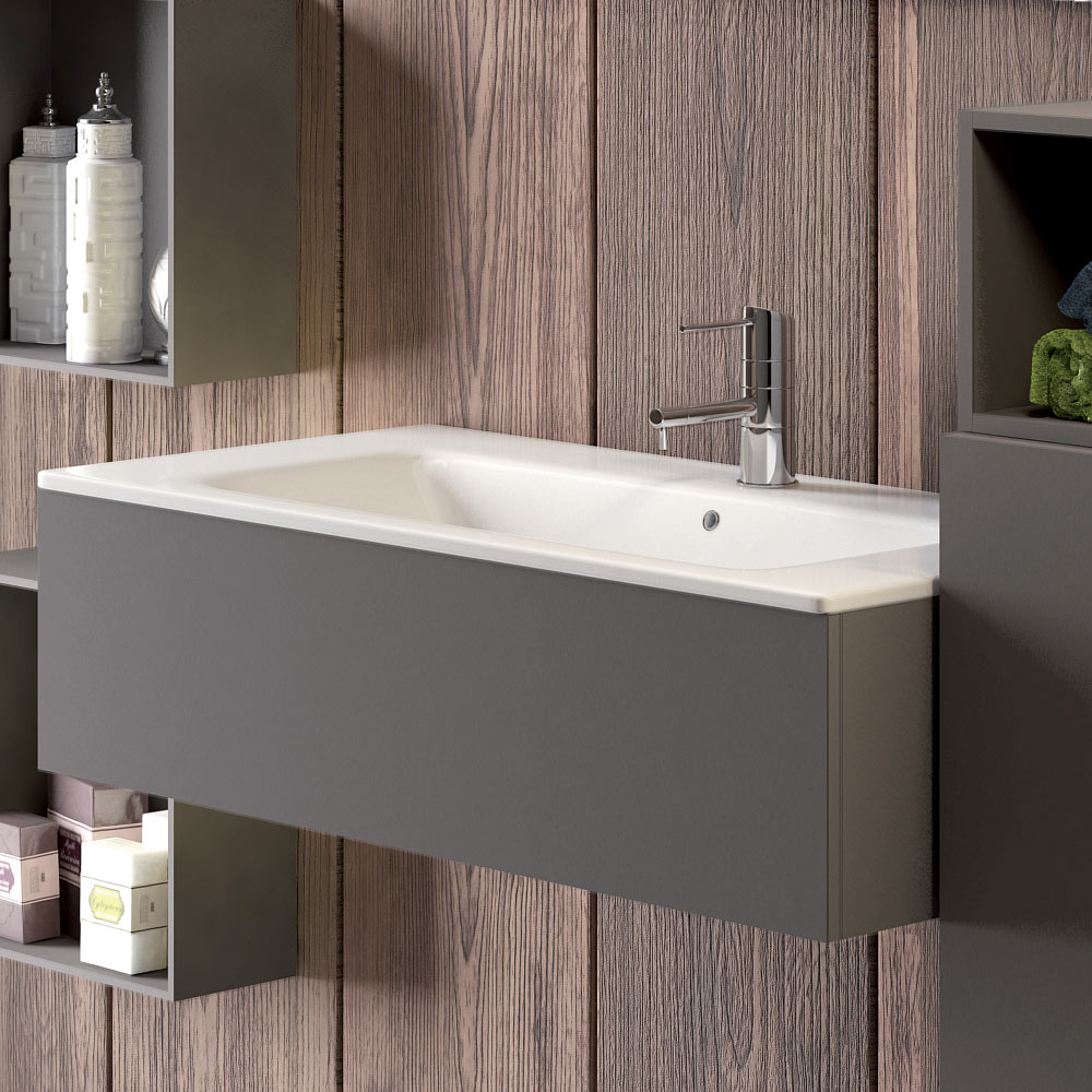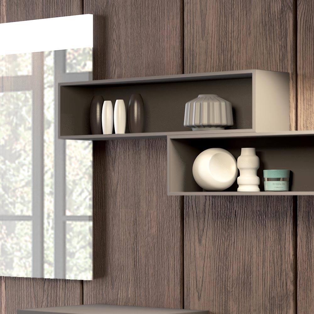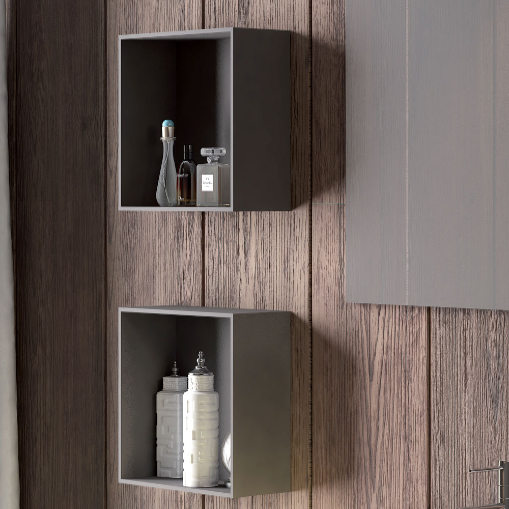 Napoli es un conjunto de muebles de baño suspendidos realizados con diferentes materiales y acabados y con posibilidad de innumerables combinaciones gracias a los diferentes elementos, para un resultado de geometrías flexibles para un baño fuera de los patrones habituales.