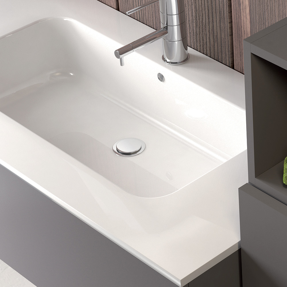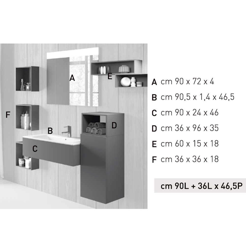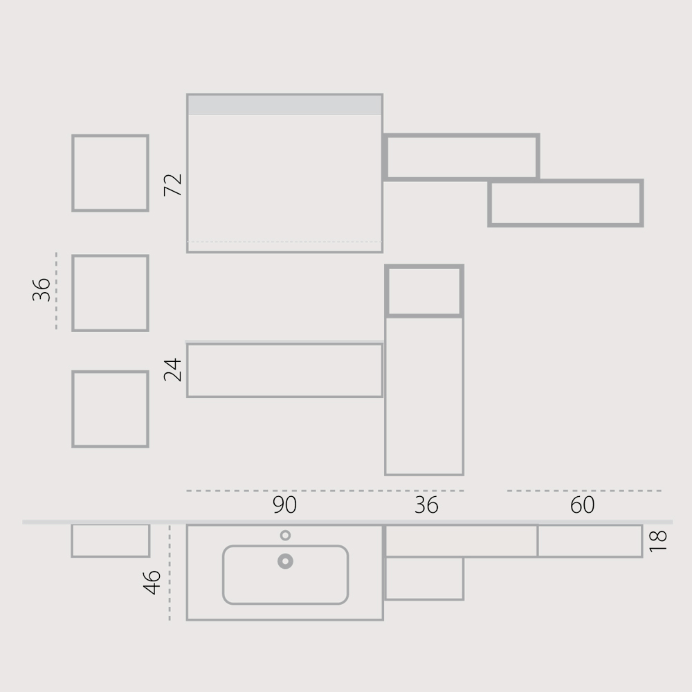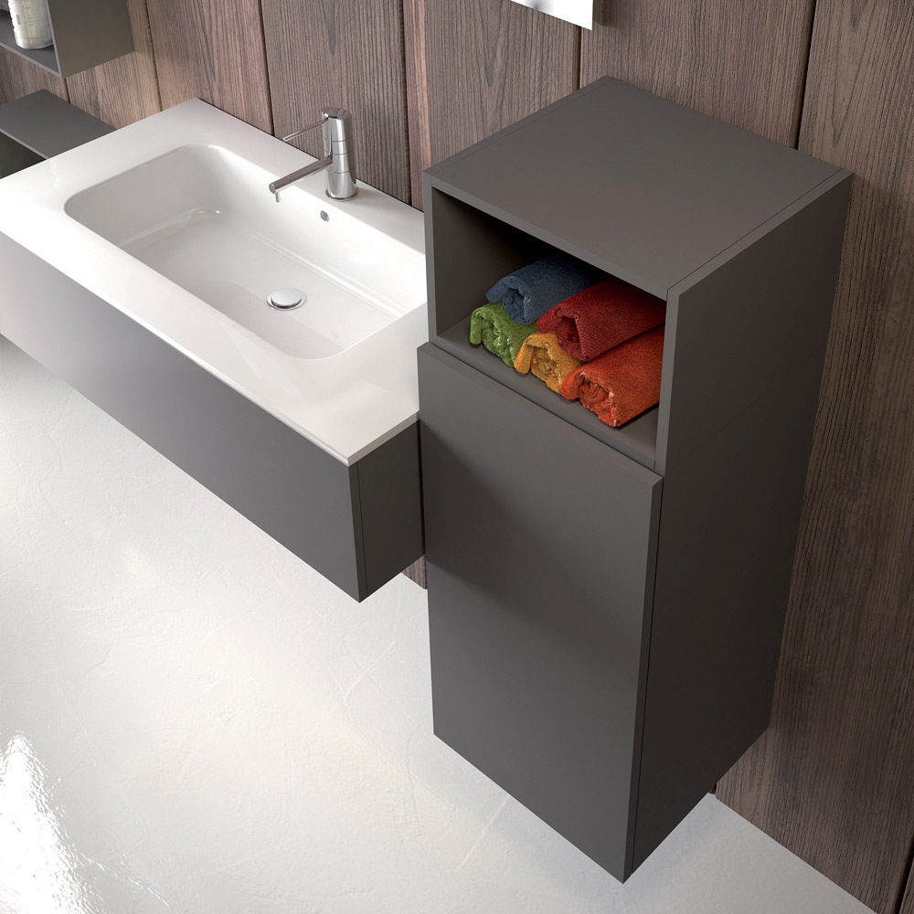 Napoli es un conjunto de muebles de baño suspendidos realizados con diferentes materiales y acabados y con posibilidad de innumerables combinaciones gracias a los diferentes elementos, para un resultado de geometrías flexibles para un baño fuera de los patrones habituales.