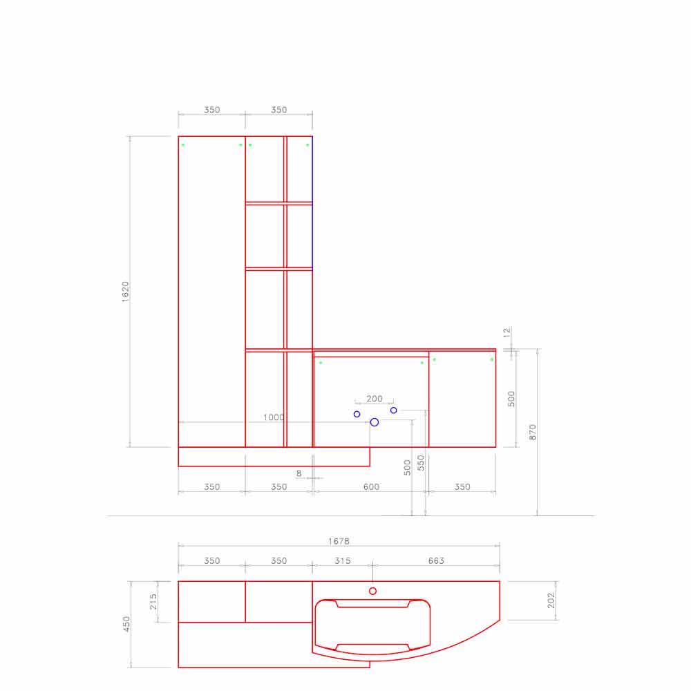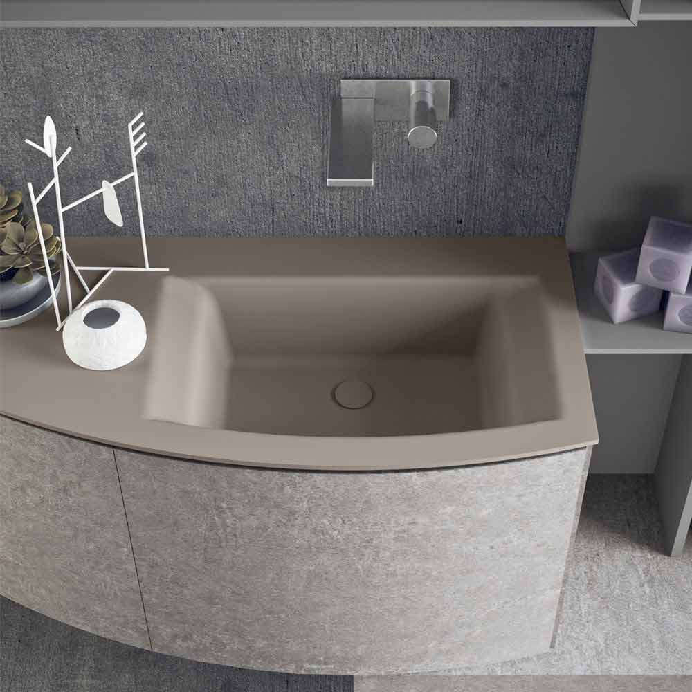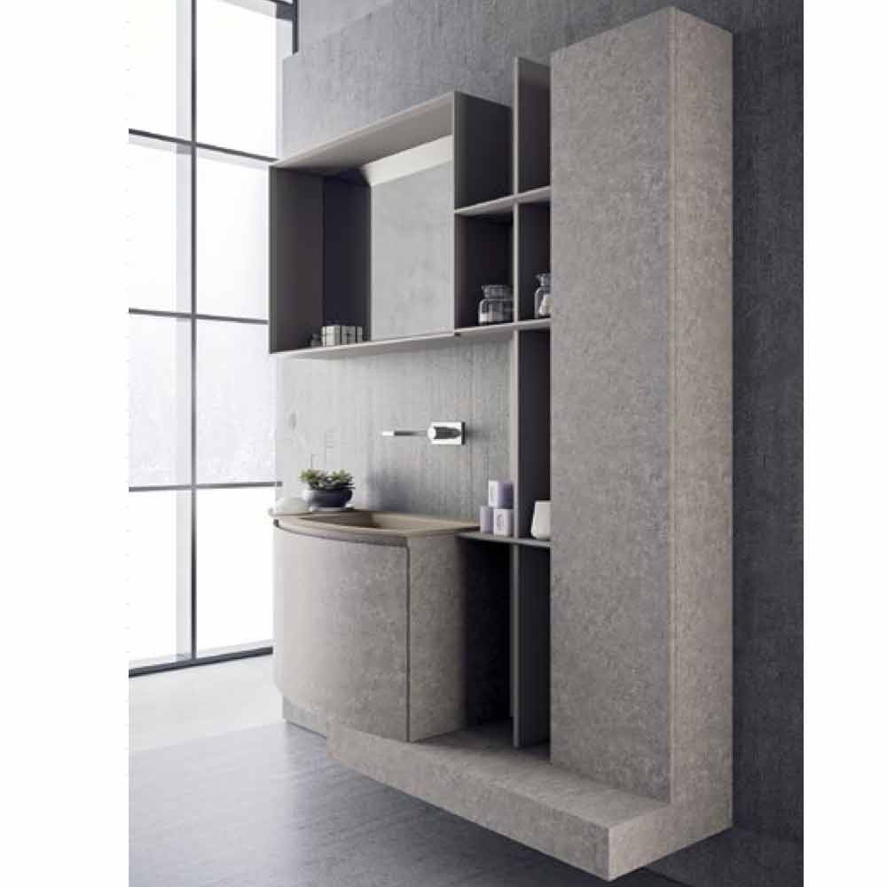 Conjunto de mueble de baño con frentes curvos en HPL portland unicolor , columna suspendida en HPL portland unicolor Al 162 cm, lavabo integrado en Teknorit gris tórtola mate , elemento abierto en lacado ratón mate, banco grueso Al 10 cm.